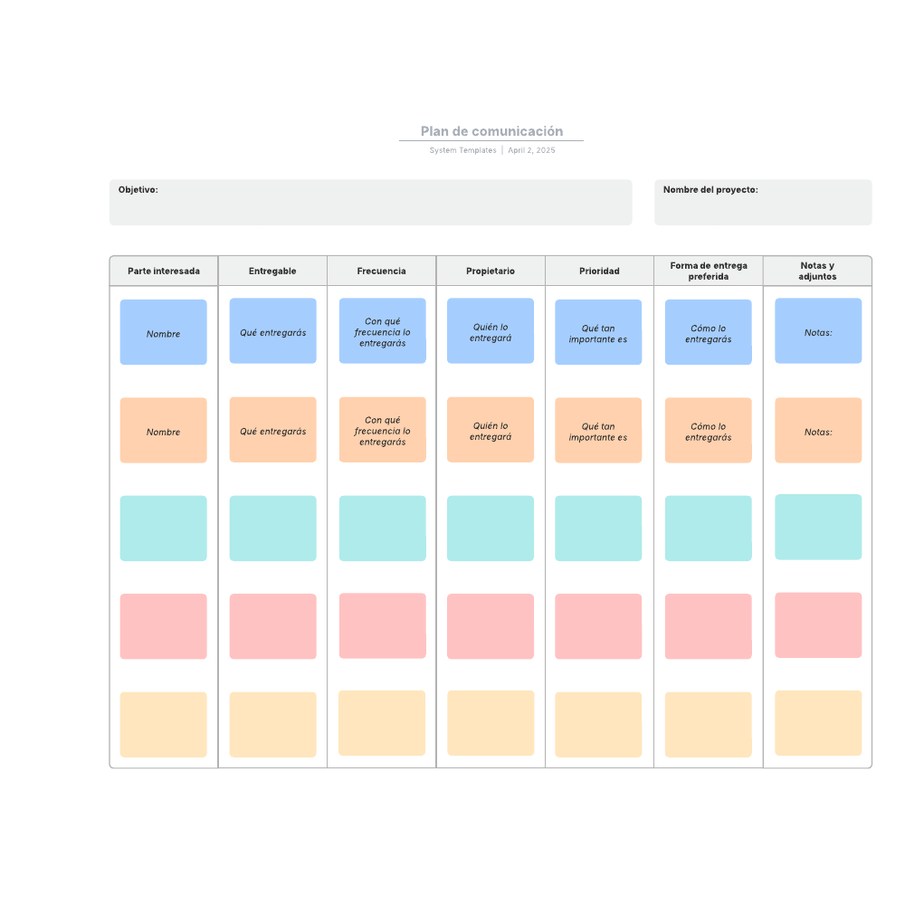 - Crea un plan de acción gráfico para que todos puedan ver fácilmente las actividades específicas que deben completarse para lograr el resultado deseado.