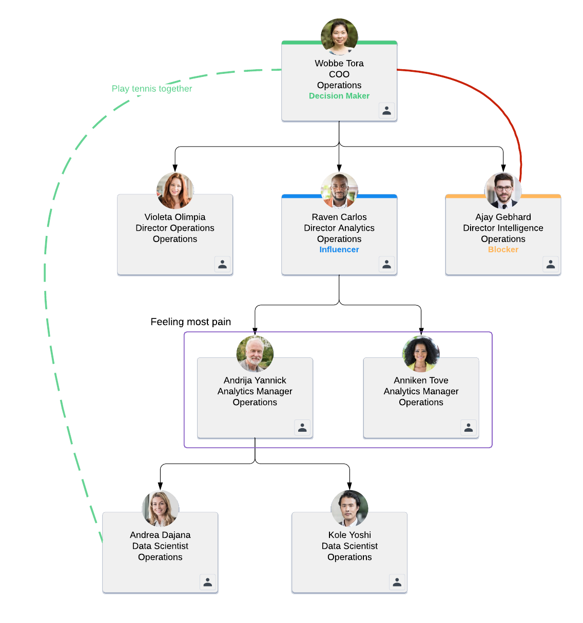 This step will help you understand which relationships can create the consensus necessary to close the deal. As you determine each contact’s status, you might find areas where you can add new lines to indicate relationships not found on the org chart. Filling in these gaps helps you better influence blockers or buyers and focus your efforts on the right people.