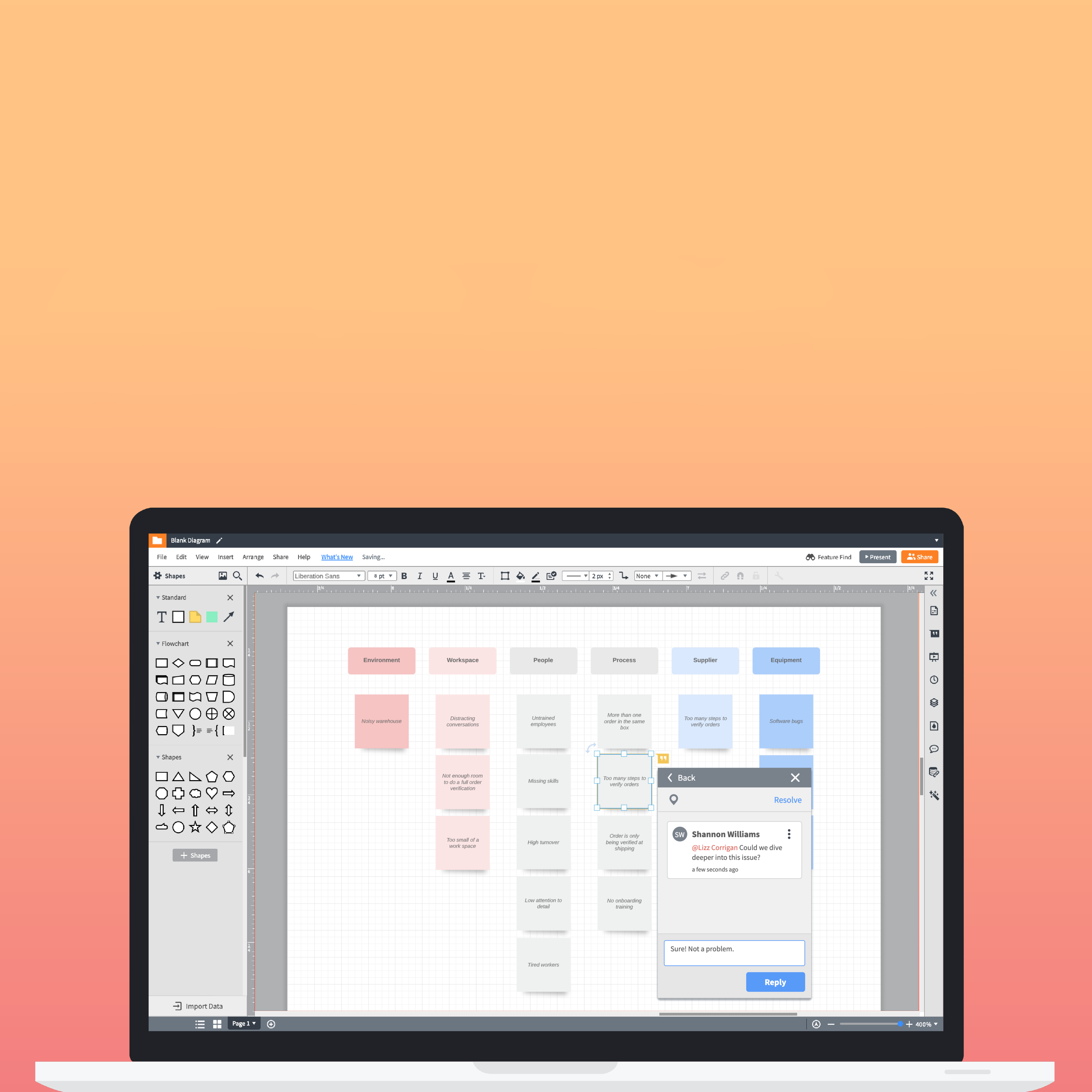- Bounce ideas off of each other by adding comments and notes to each other’s shapes.