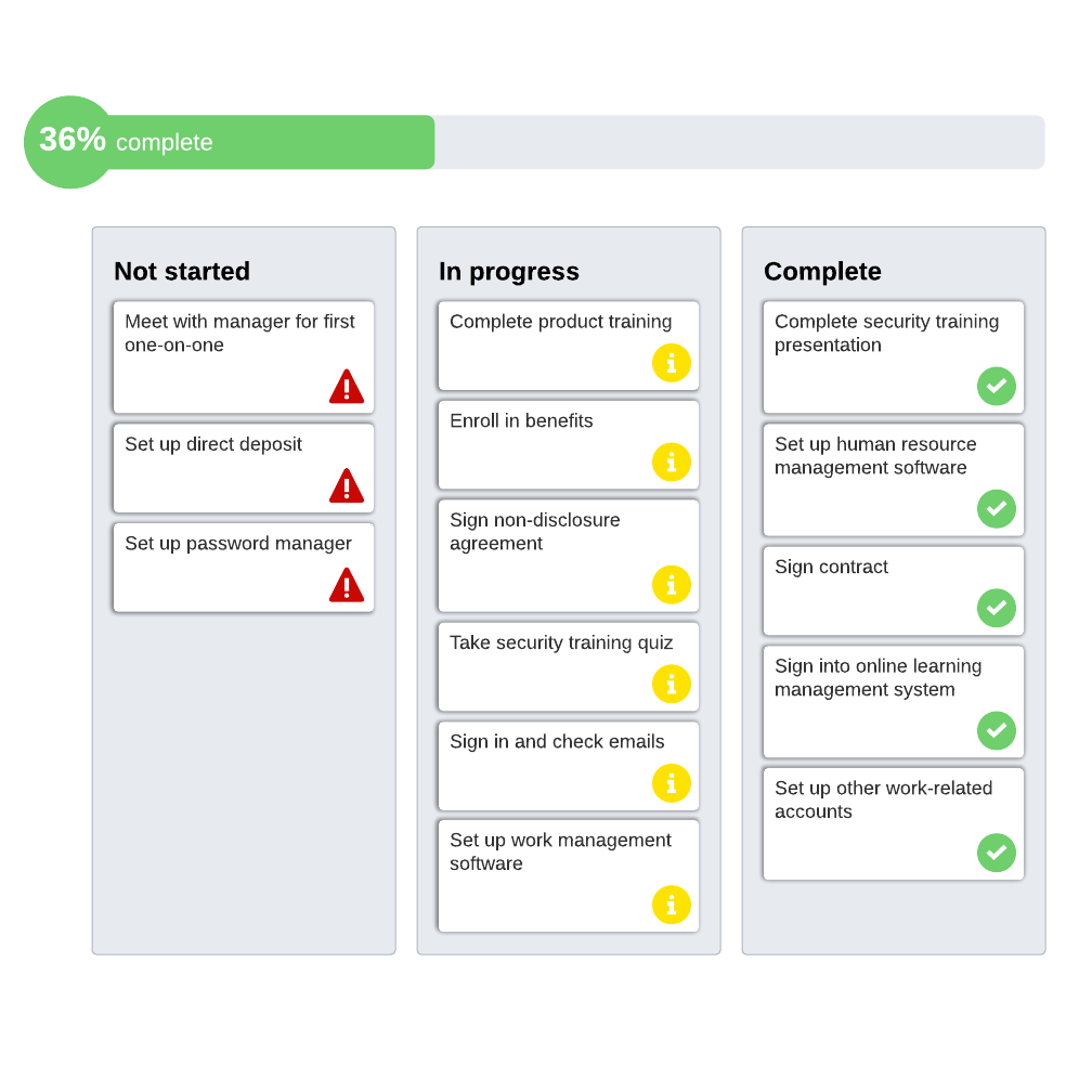 Jacob Scoville, an associate manager on the customer success team, set up Smart Containers organized by category and filled with tasks that his new hires need to complete. Once the new hire has completed the task, they can move it over to the “Complete” column, and the status bar at the top will show what percentage of the training they’ve finished.