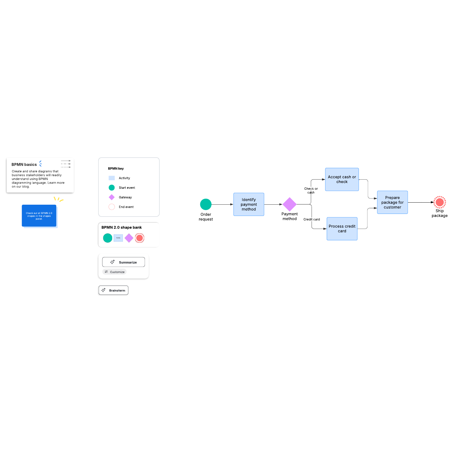 Build your own business process modeling notation (BPMN) diagrams in Lucidchart. With just a few clicks in this BPMN Tool, access all the shapes you need to create a polished and professional business process map, including tasks, transactions, conversions, call activities, data storage, and more.