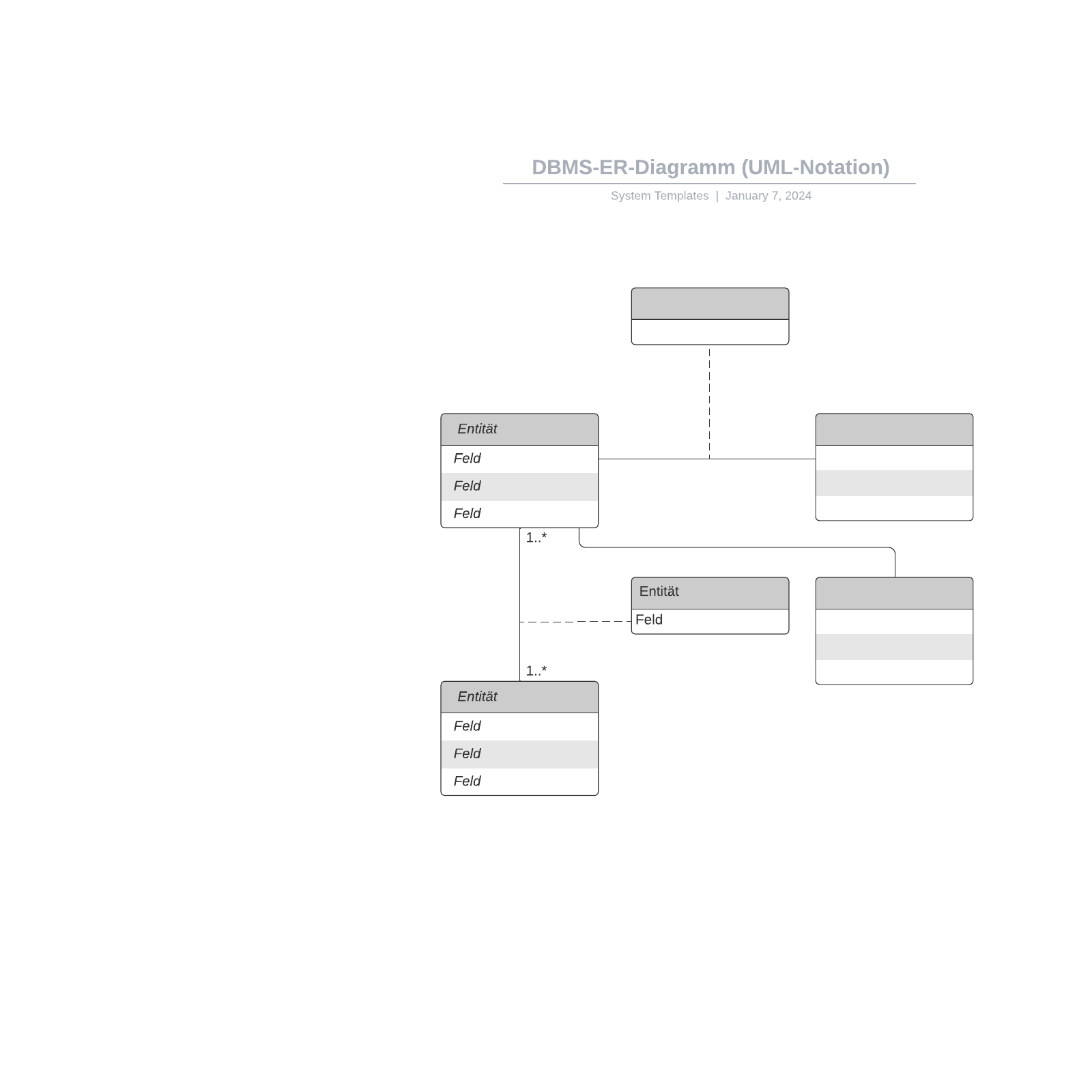 Unser ER Diagramm Tool vereinfacht die Datenbankmodellierung für konzeptuelle und physische Diagramme. Mit den Drag-and-Drop unseres ERD Tools können Sie mühelos Standard-ERD-Formen und Symbole auf die Arbeitsfläche ziehen und so einfach zwischen Beziehungen, Entitäten und deren Attributen unterscheiden. Beziehen Sie Tabellen, Felder und Primär- oder Fremdschlüssel mit ein. Verbinden Sie anschließend jede Entität mit den konkreten Krähenfußnotationen, um die Kardinalität jeder Entität anzugeben. Alternativ können Sie einfach eine Vorlage auswählen und sie individuell anpassen indem Sie Symbole und Notationen, die Ihrer Datenbankstruktur entsprechen, verwenden.