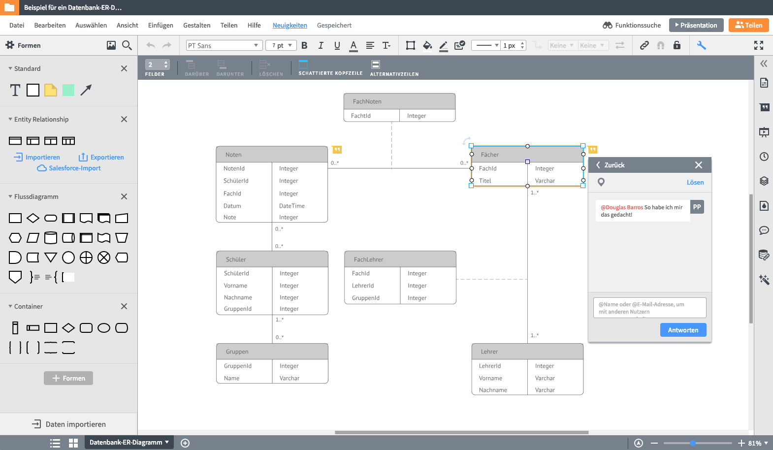 Dank der cloudbasierten, intelligenten Diagrammerstellung können Sie von überall aus Diagramme anlegen – unabhängig vom Gerät, Browser oder Betriebssystem. Laden Sie Teammitglieder dazu ein, Sie rasch beim Einschätzen der Genauigkeit Ihres wachsenden, immer komplexer werdenden ERDs zu unterstützen. Lucidchart macht die gemeinsame Arbeit an ER Diagrammen online und in Echtzeit ganz einfach – für Mac, PC und Linux. Teilen Sie Ihr Dokument per E-Mail oder generieren Sie eine URL. Über @mention-Erwähnungen und den Kommentarfinder können Sie Personen zu bestimmten Teilen Ihres Diagramms führen. Sie können Ihr Diagramm auch in Jira oder Confluence exportieren oder in eine Unternehmenspräsentation aufnehmen, um das Verständnis für Personen mit unterschiedlich hohem technischem Wissen zu erleichtern.