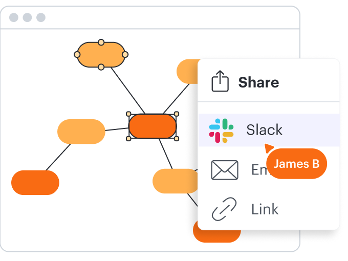 Erstellen Sie eine gemeinsam nutzbare URL oder verwenden Sie den Präsentationsmodus, um Stakeholdern Ihre Mindmap online zu präsentieren. Integrieren Sie Lucidchart mit beliebten Apps wie Google Workspace, Microsoft 365 und Slack zum optimalen Teilen und Zentralisieren von Ressourcen.