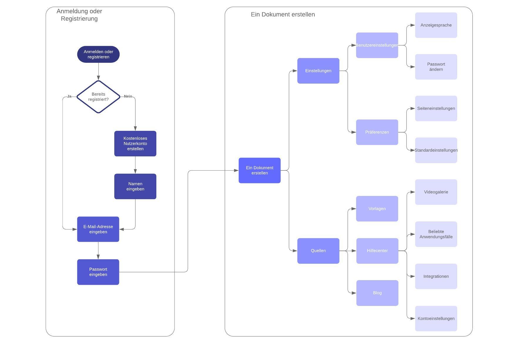 Eine Flowchart ist eine visuelle Darstellung der Schritte und Entscheidungen, die zum Abschluss eines Prozesses führen. Egal ob Sie noch nie ein Ablaufdiagramm erstellt, oder bereits Erfahrung haben: unsere kostenlose Flowchart-Software hat alles, was Sie brauchen, um jede Art von Prozess darzustellen. Mit unserer umfangreichen Vorlagenbibliothek können Sie in wenigen Minuten eine beeindruckende, leicht verständliche Flowchart online erstellen. Die Drag-and-Drop-Funktion macht es einfach, Formen in einem logischen Ablauf zu platzieren und anzuordnen.