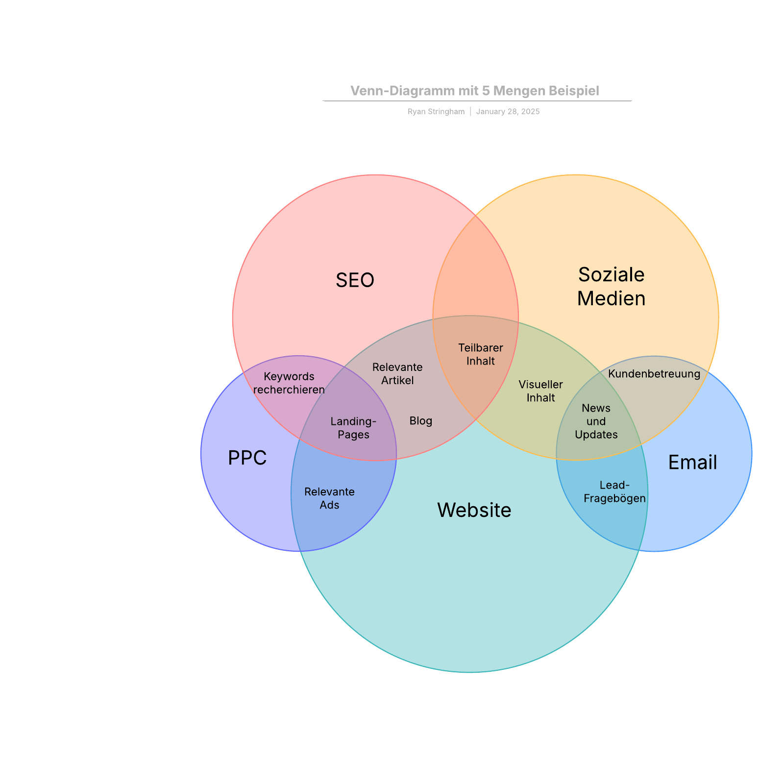 Ein Venn Diagram - auf Deutsch als Venn Diagramm bekannt - verwendet überlappende Kreise oder andere Formen, um die logische Beziehung zwischen zwei oder mehr Mengen darzustellen. Häufig dienen sie dazu, Dinge grafisch zu organisieren, indem hervorgehoben wird, worin sie sich unterscheiden und wo sie Gemeinsamkeiten besitzen.