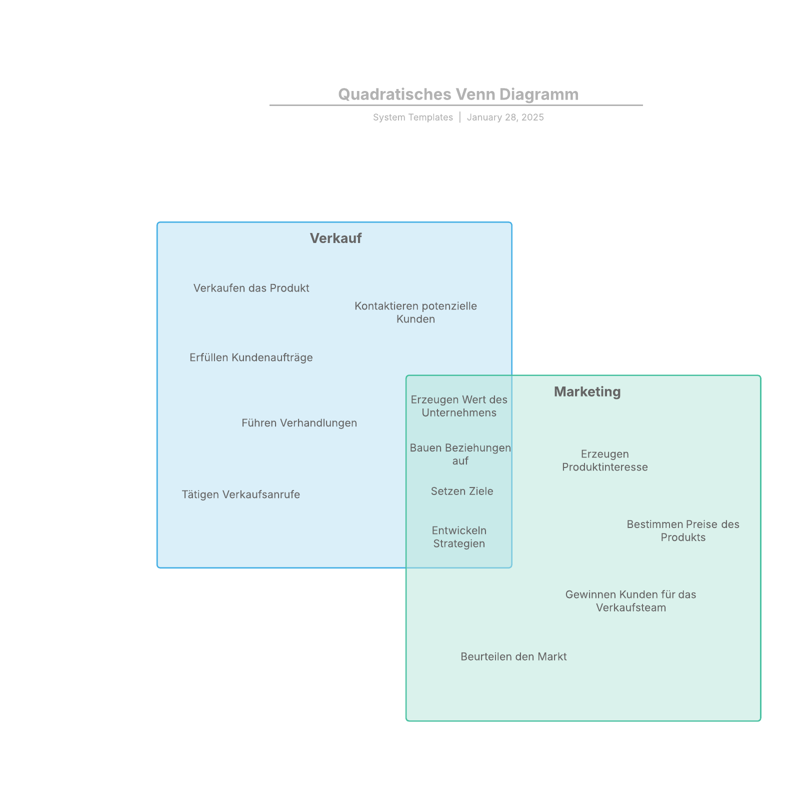 Venn Diagramm werden auch als Mengendiagramme oder logische Diagramme bezeichnet und kommen vor allem in der Mathematik, Logik, Statistik, Pädagogik, Linguistik, Informatik und im Geschäftswesen zum Einsatz. Die meisten Menschen lernen diese Diagramme bereits in der Schule im Mathematikunterricht kennen, da die Mengenlehre im Rahmen der Neuen Mathematik Einzug in Lehrpläne gehalten hat. Venn Diagramm können einfache Diagramme mit zwei oder drei Mengenelementen sein. Oder es handelt sich dabei um anspruchsvolle Diagramme, unter Umständen sogar mit 3D-Präsentationen, wenn sie sechs, sieben oder sogar mehr Mengen umfassen. Mithilfe dieser Diagramme soll illustriert werden, wie Elemente in einem bestimmten „Universum“ oder „Segment“ zueinander in Beziehung stehen. Für Benutzer sind Venn Diagramm eine hervorragende Möglichkeit, um Daten klar und effektiv zu visualisieren. Aus diesem Grund werden diese Diagramme häufig in Präsentationen und Berichten verwendet. Venn Diagramm sind eng mit dem Eulerdiagramm verwandt. In Eulerdiagrammen werden allerdings nur die tatsächlichen Überschneidungen dargestellt. In Venn Diagramm hingegen werden mögliche Überlappungen illustriert, auch wenn eine Menge leer ist.