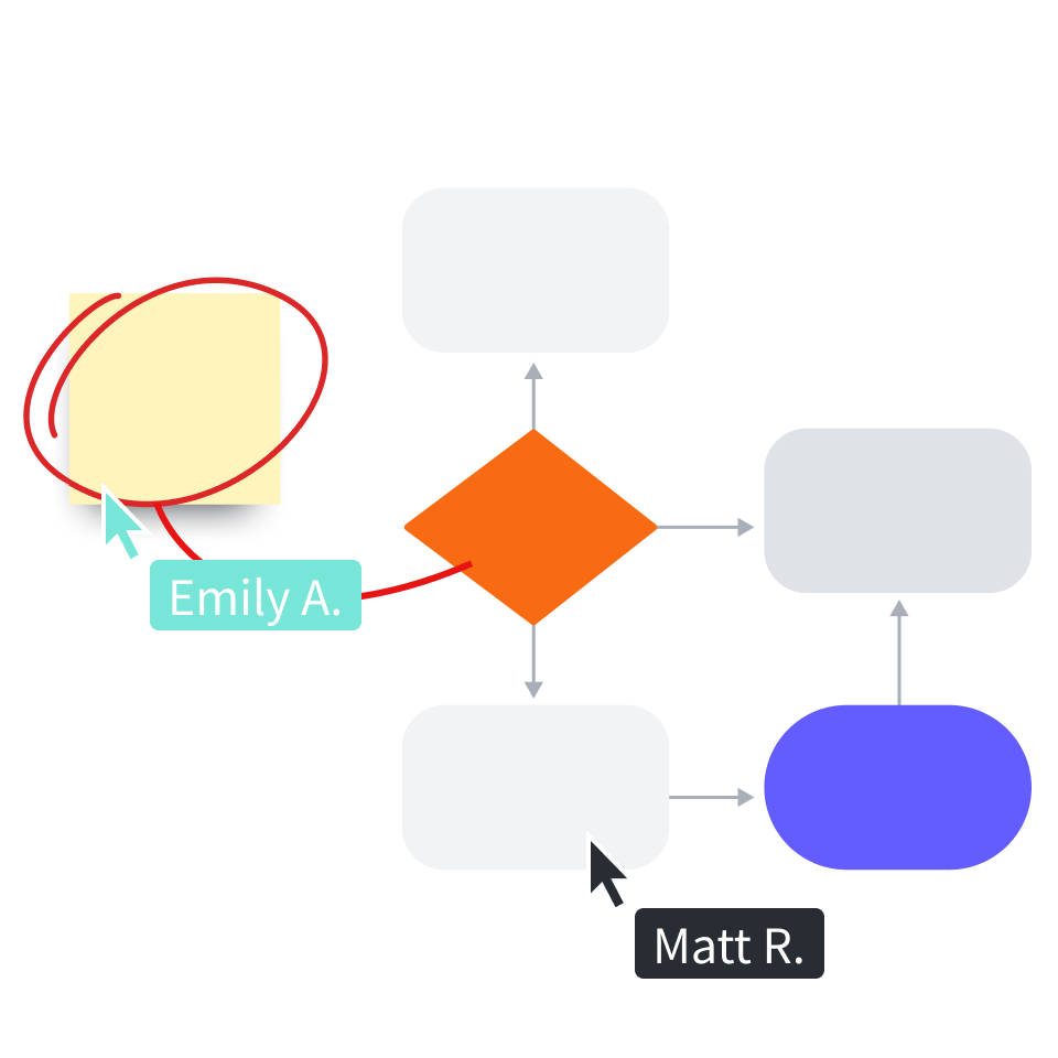 Arbeiten Sie unabhängig vom Aufenthaltsort in Echtzeit mit Ihrem gesamten Team zusammen. Selbst, wenn Sie Heimarbeiter oder weltweit verstreute Kollegen im Team haben, hält Lucidchart alle auf dem neuesten Stand, sodass Sie schneller zusammenarbeiten können. Lucidchart bietet sogar Nutzende mit eingeschränktem Zugriff auf Ihre gesamte Organisation, sodass alle auf wichtige Unterlagen zugreifen können.