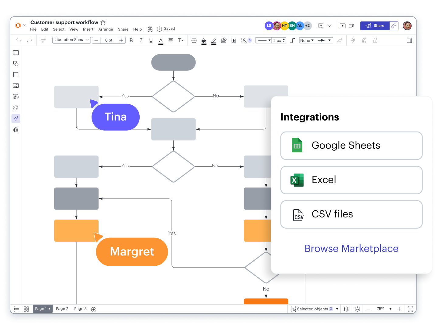 Import data to Lucidchart from Google Sheets, Excel, or CSV files to link data to your diagrams. Use additional data-backed features like conditional formatting, formulas, dynamic shapes, and more. draw.io only supports basic data import and lacks the data-backed features mentioned above.