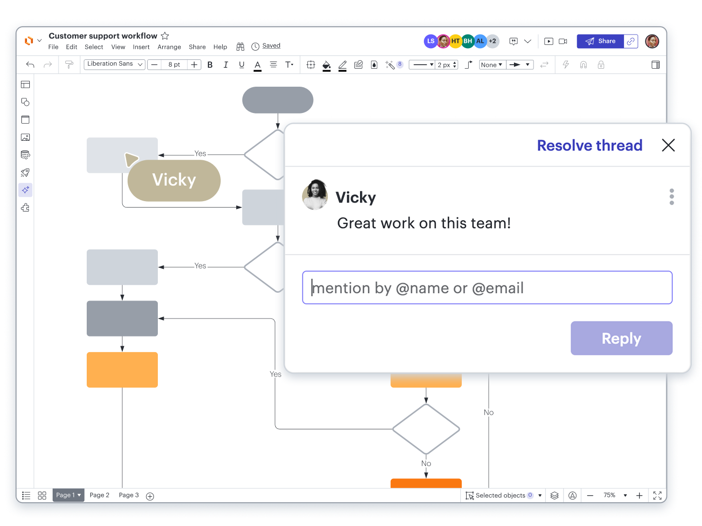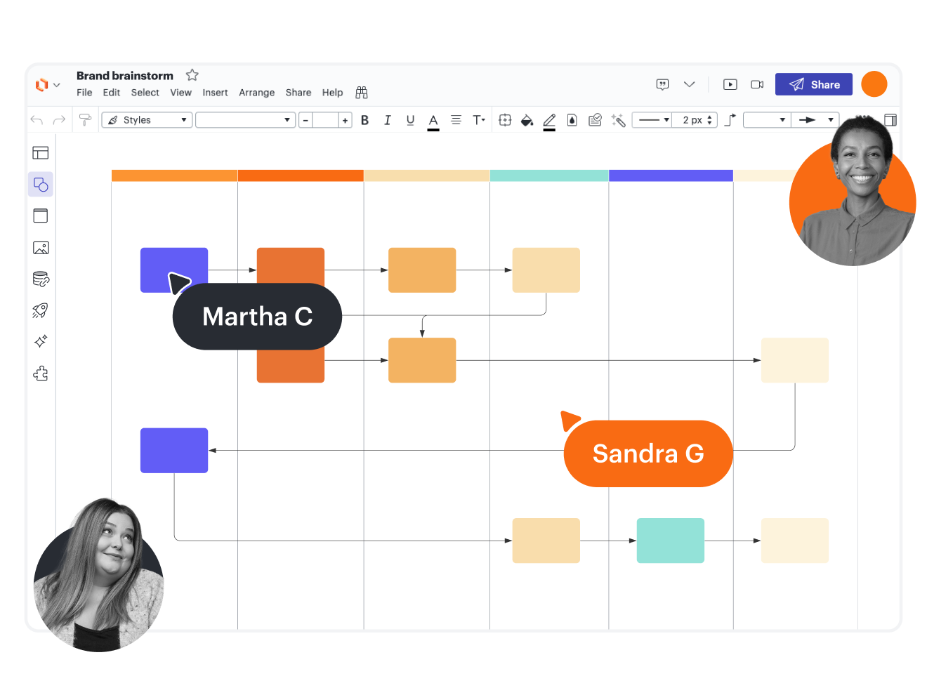 Lucidchart was built for collaboration. It allows teams to securely share, view, and edit diagrams together in real time. draw.io, however, hinders collaboration. Its desktop version is offline, which prevents synchronous viewing and editing of diagrams by multiple users.