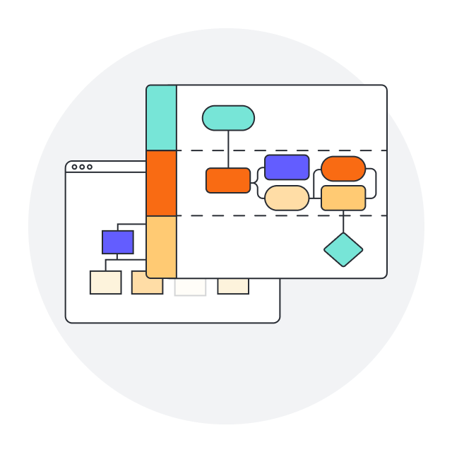 Elige una de las muchas plantillas para diagramas de flujo de Lucidchart, y simplemente completa los datos adecuados en las figuras que correspondan. También puedes empezar desde cero con un lienzo en blanco para crear tu diagrama de flujo en línea. Si ya tienes tu propia plantilla o un diagrama de flujo que hayas creado y que deba actualizarse, importa tu diagrama de Lucidspark, Visio, Gliffy, Omnigraffle o Diagrams.net a Lucidchart. Si solo tienes datos para importar, puedes importar tu conjunto de datos desde Google Sheets o Excel.