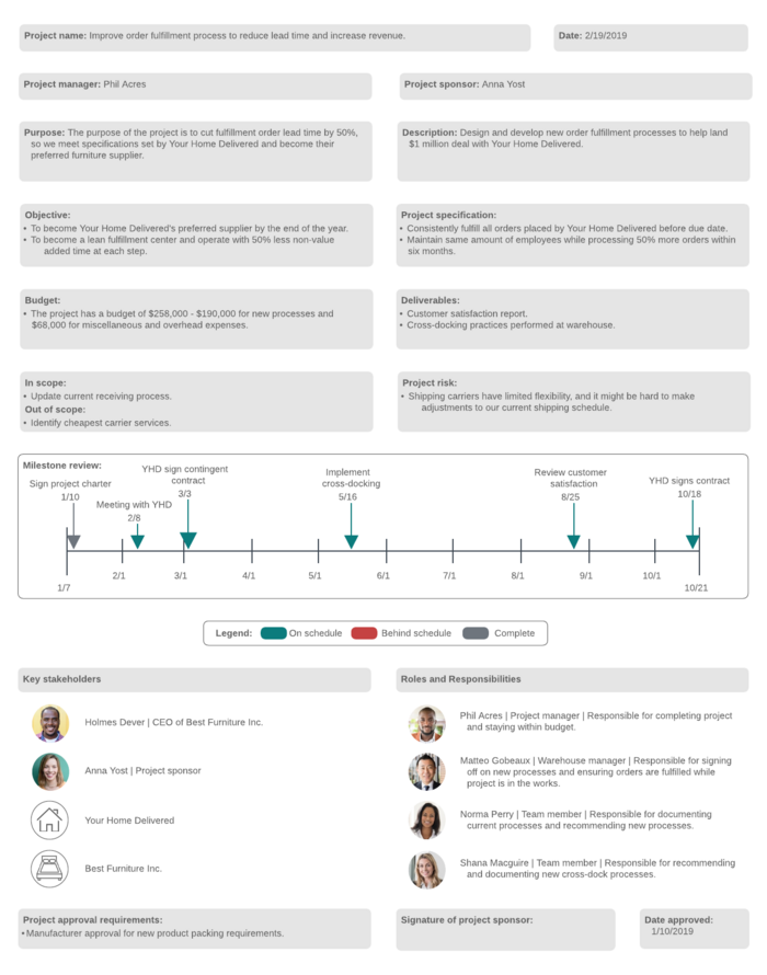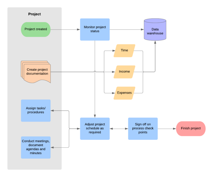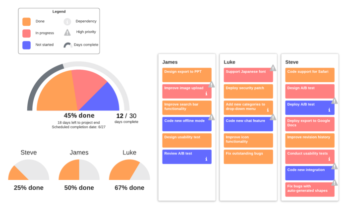 Una vez que hayas escogido los miembros del equipo de proyectos, puedes empezar a asignar roles, tareas, flujos de trabajo y dependencias. Crea rápidamente diagramas de flujo de trabajo, cronogramas, diagramas de Gantt, plantillas de panel scrum, tableros Kanban y otros documentos usando nuestras plantillas de gestión de proyectos. Nuestro software para la administración de proyectos te permite asegurarte de que los miembros del equipo y las partes interesadas puedan ver el alcance completo del proyecto y todos estén en sintonía.