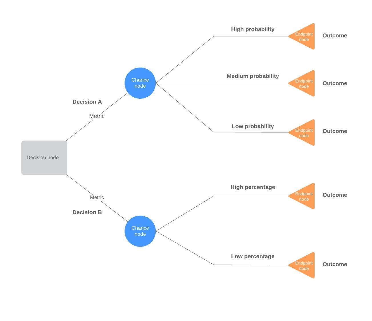 Hay tres tipos diferentes de nodos: nodos de probabilidad, nodos de decisión y nodos terminales. Un nodo de probabilidad, representado con un círculo, muestra las probabilidades de ciertos resultados. Un nodo de decisión, representado con un cuadrado, muestra una decisión que se tomará, y un nodo terminal muestra el resultado definitivo de una ruta de decisión.