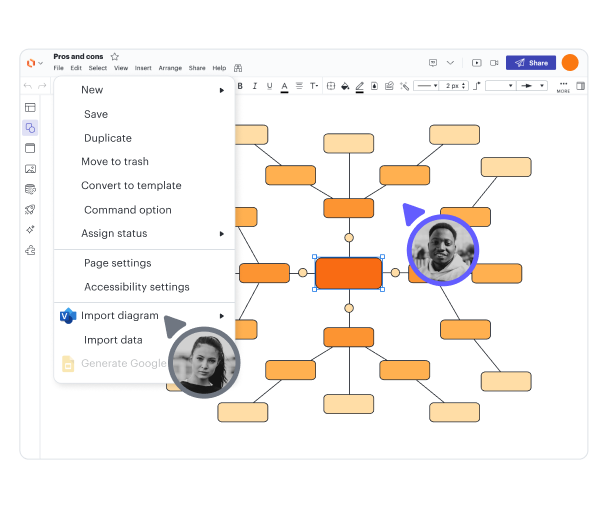 Import mind maps from Visio, Gliffy, OmniGraffle, and diagrams.net to continue building on your previous work. You can also import ideas from any TXT file—Lucidchart will help you organize them, and you can export the finished mind map as a PDF, JPEG, or PNG when you’re done.