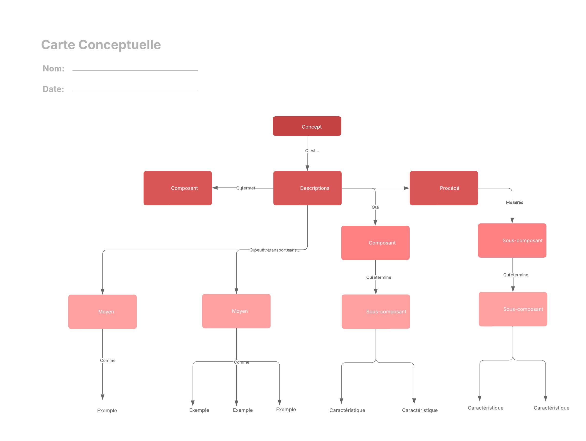 Une carte conceptuelle (ou schéma conceptuel) vous aide à visualiser les liens entre des concepts, des idées, des événements ou des notes. Ces diagrammes sont couramment utilisés pour préparer des cours, créer des guides d’étude ou ébaucher des projets d’écriture. Pour utiliser une carte conceptuelle, inscrivez vos idées dans des cercles (également appelés nœuds). Contrairement à une carte mentale qui part du centre pour aller vers l’extérieur, une carte conceptuelle fonctionne généralement de haut en bas, de manière hiérarchique. Connectez vos cercles à l’aide de lignes ou de flèches (également appelées arcs) et étiquetez les lignes pour montrer comment les idées sont liées les unes aux autres.