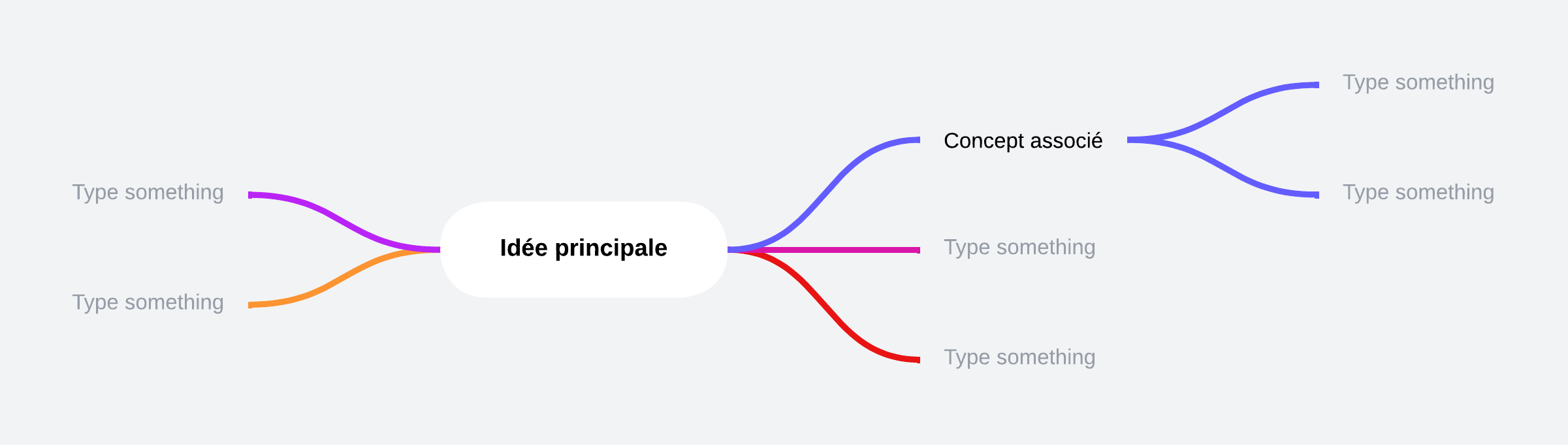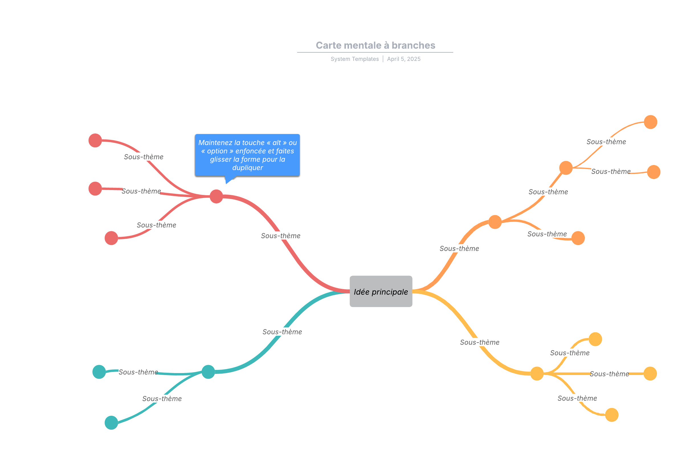 Une carte mentale (aussi appelée carte heuristique ou encore mind map en anglais) vous permet de visualiser vos idées et vos réflexions. Commencez à partir d'une idée centrale, puis créez des branches à partir de celle-ci vers des concepts similaires. À partir de là, vous pouvez ajouter et connecter des idées librement. Les cartes mentales sont idéales pour les personnes qui réfléchissent de manière visuelle et leurs adaptabilités permettent d'avoir des brainstormings et des idées et projets qui sortent de l'ordinaire.