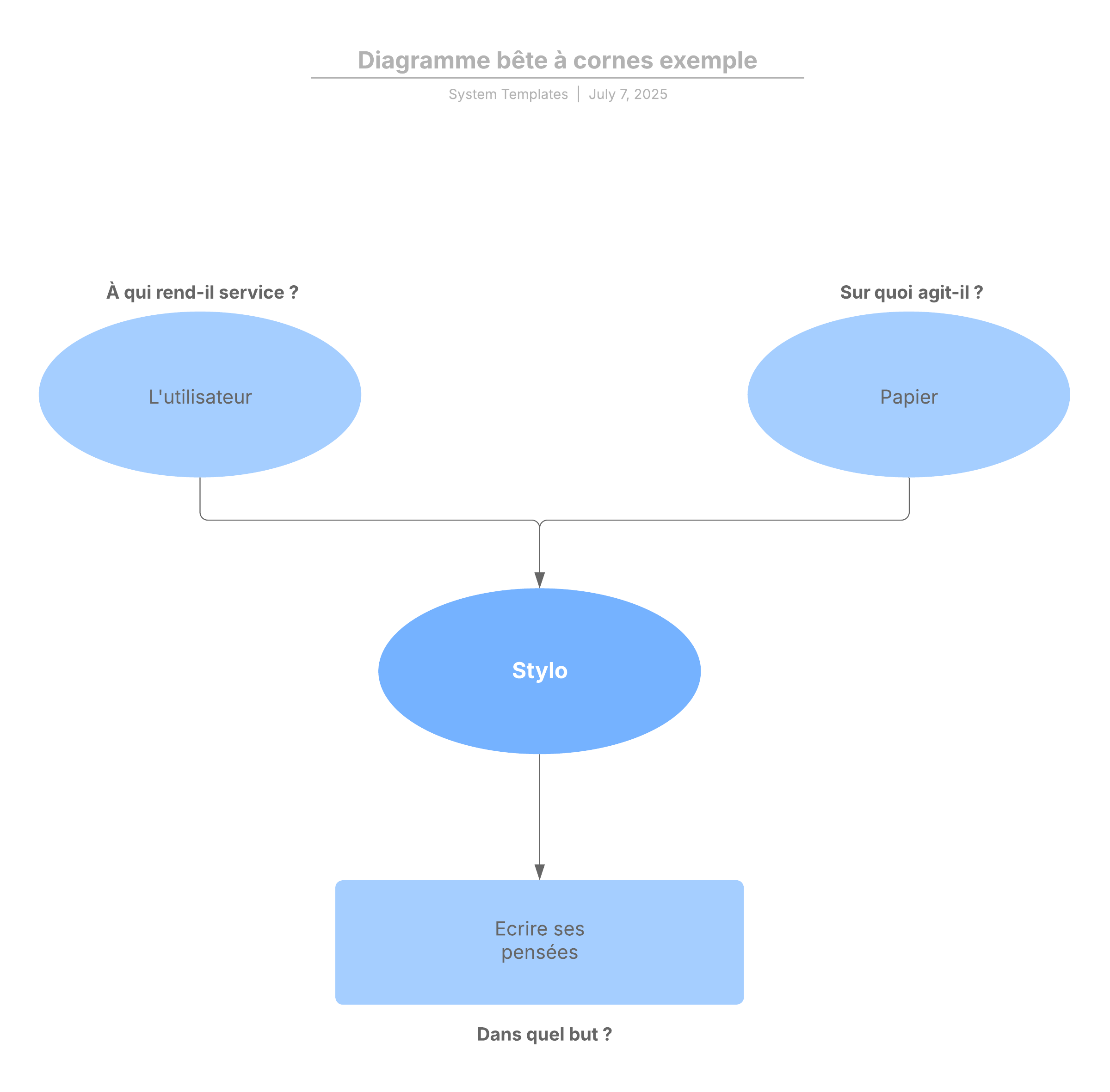 Les trois questions qui permettent d’exprimer le besoin sont : À qui ce produit rend-il service ? Sur quoi agit-il ? Quel est son but ? Pour faire un diagramme bête à cornes en ligne, vous vous devez d’y répondre.