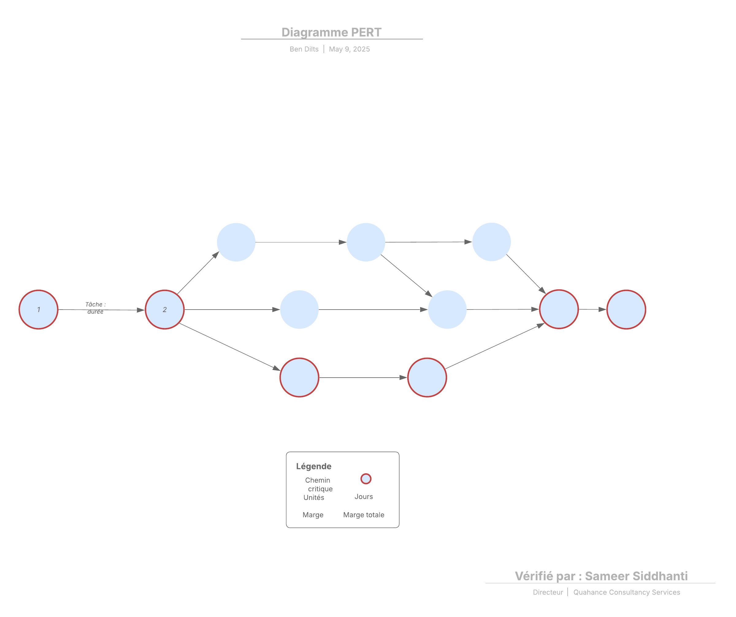 La méthode du chemin critique (en anglais, Critical Path Method ou CPM) est une technique normalisée utilisée pour identifier et planifier la séquence des tâches et des événements critiques qui déterminent la durée et l'achèvement d'un projet. Un diagramme de chemin critique clairement défini permet aux chefs de projet et aux parties prenantes de gérer efficacement les attentes et les échéances dès le début du projet. Utilisez notre outil CPM online pour concevoir facilement les grandes lignes de votre projet. Vous pouvez calculer les durées, déterminer l'importance des différentes tâches et comparer l'avancement prévu et réel de votre projet jusqu'à son achèvement.