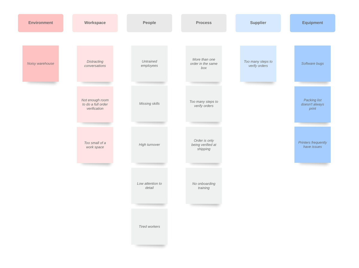 Au fur et à mesure que vous ajoutez vos facteurs contributifs, revenez en arrière et organisez-les de manière à ce que chaque facteur soit placé dans la catégorie la plus appropriée. Chaque catégorie comprendra probablement plus d'un facteur.