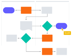 Les fonctionnalités de collaboration en temps réel de Lucidchart vous permettent d’obtenir immédiatement l’adhésion et les observations des parties prenantes. Les commentaires et les modifications sont mis à jour automatiquement, de sorte que la question du contrôle des versions ne se pose jamais lorsque vous travaillez sur un même document avec plusieurs personnes. Notre logiciel de diagramme de flux de travail est basé dans le cloud et fonctionne de façon identique sur Mac et PC.