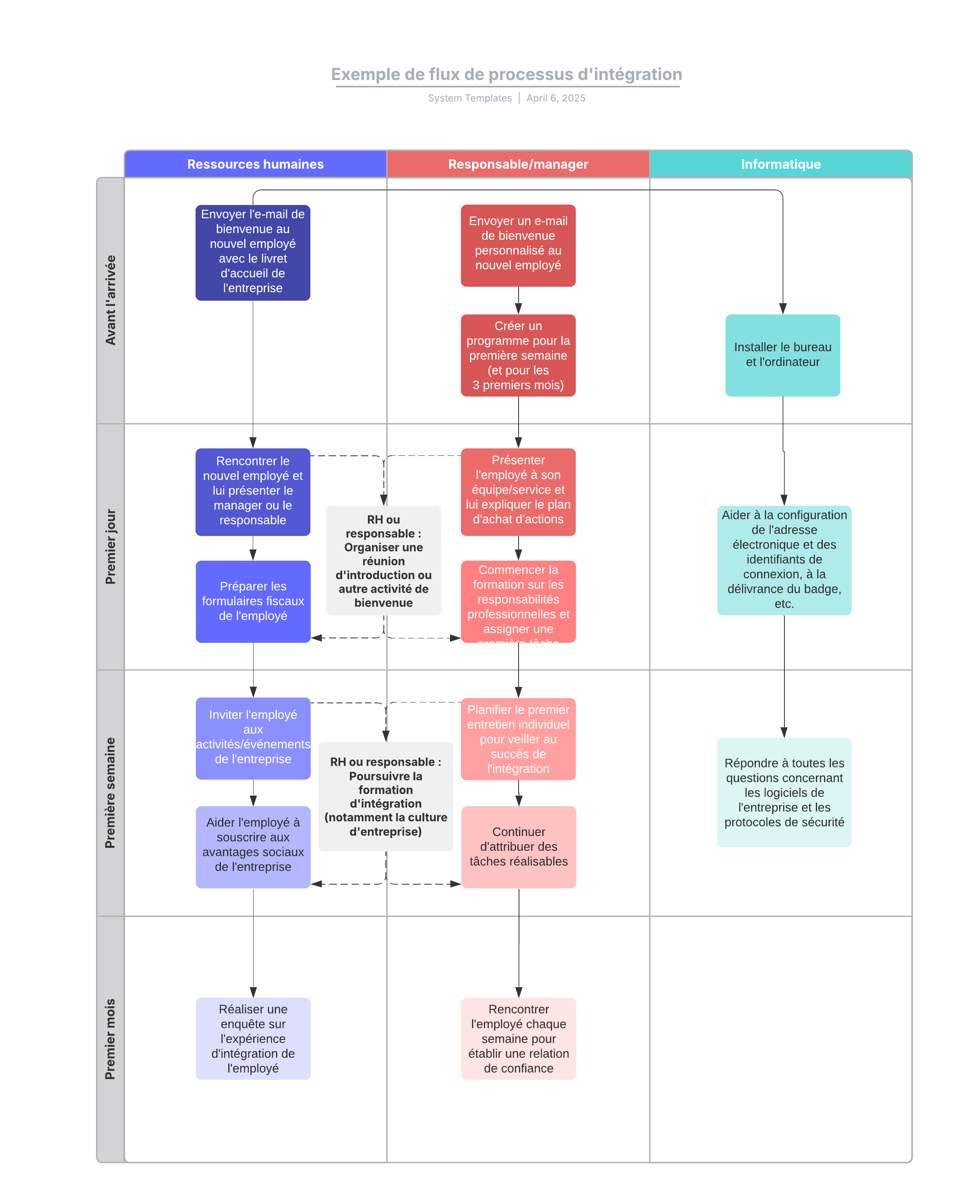 Un diagramme de flux de travail, ou workflow diagram, fournit une représentation visuelle des processus de votre équipe. Il inclut notamment le récapitulatif des différentes tâches et les intervenants auxquels elles sont attribuées. Notre logiciel de modélisation des flux de travail vous permet de créer, d’actualiser et de partager facilement des flux de travail afin d’optimiser les opérations de votre entreprise, de réduire vos dépenses, et d’identifier les blocages et points à améliorer.