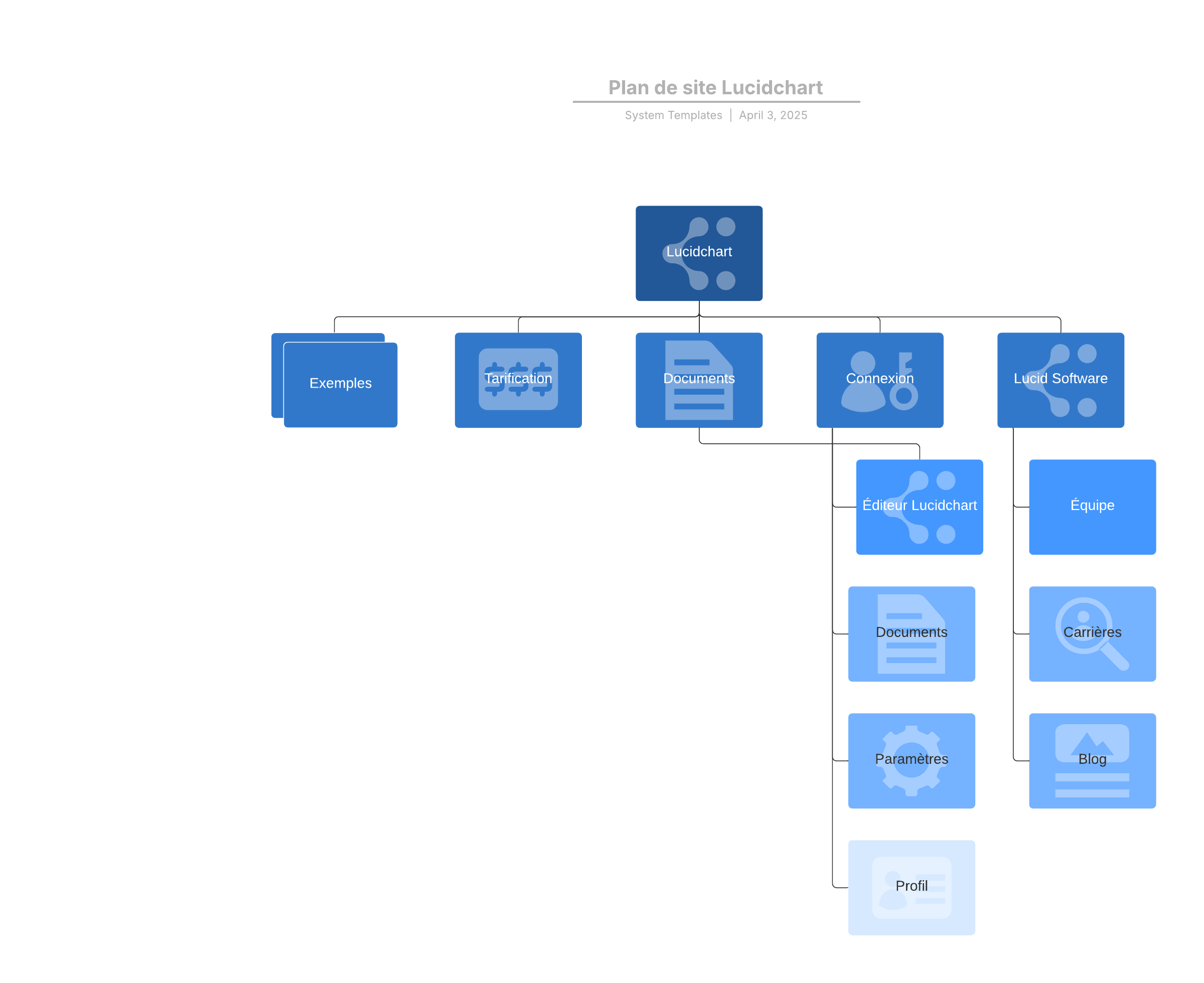 Lucidchart est une application de création de diagrammes intelligente qui facilite la création de plans de site visuels grâce à des formes à glisser-déposer, des modèles prêts à l’emploi et bien plus encore.