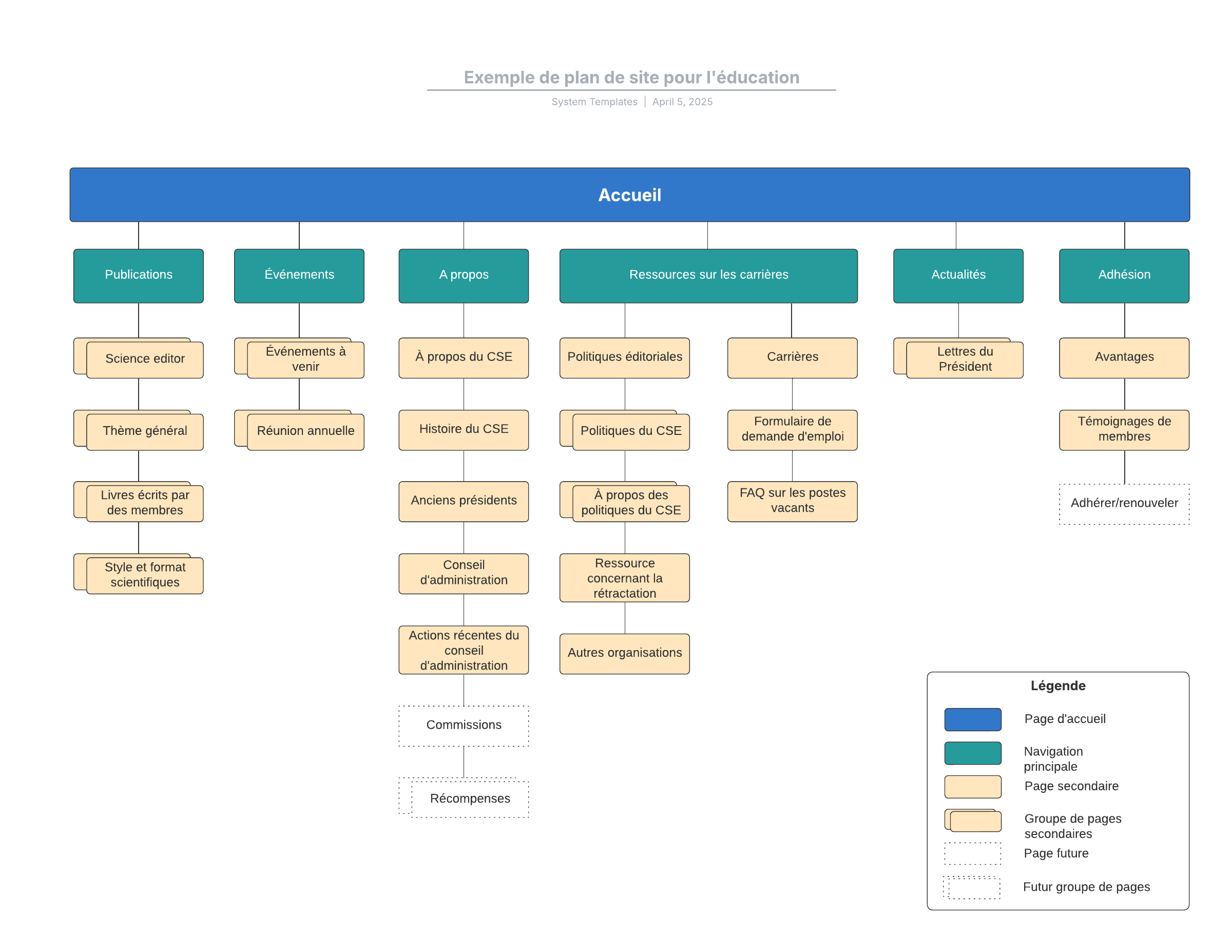 Un plan du site visuel représente la structure de votre site Web sous forme de diagramme facile à comprendre. Le fait de pouvoir schématiser l’architecture et les liens de votre site Web vous permet d’analyser son état actuel et de prévoir vos besoins futurs. Cela facilite également la planification des ressources, car vous pouvez identifier exactement les moyens et le budget nécessaires à la conception, à la mise en œuvre et à la maintenance de votre site Web.