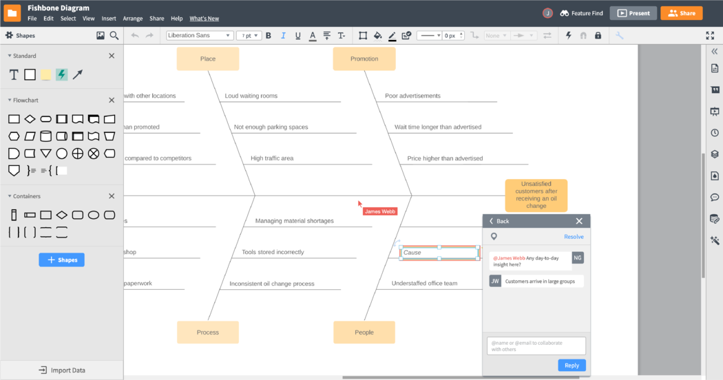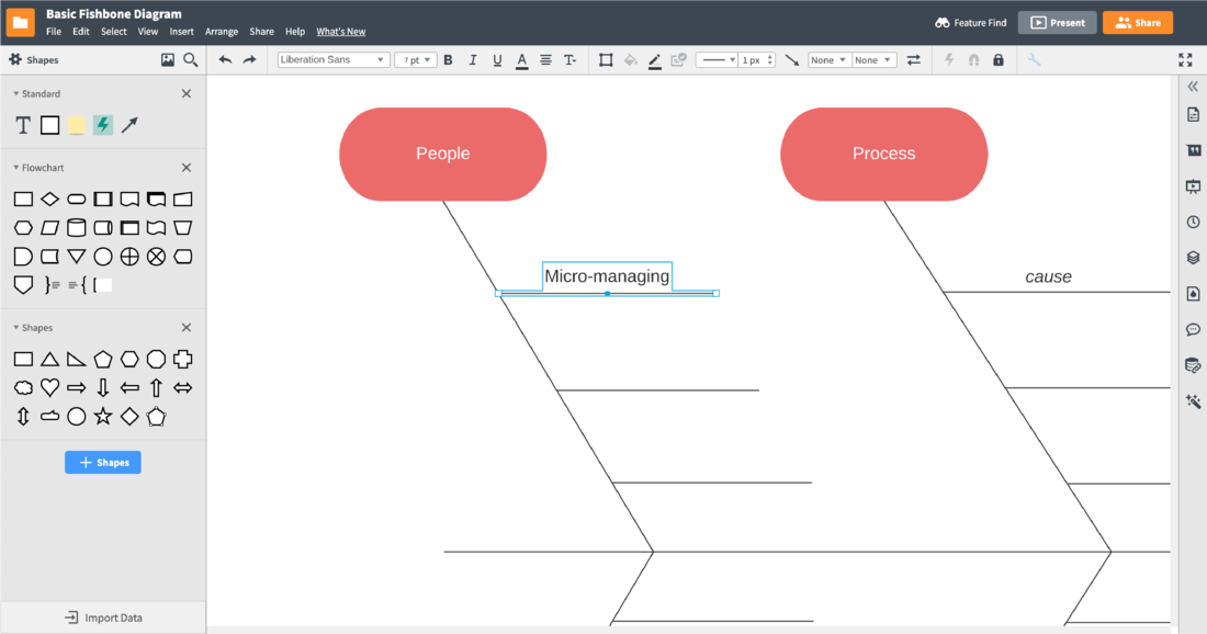 Lucidchart ti offre la libertà di aggiungere le righe e il testo di cui necessiti per individuare tutte le possibili cause primarie. Il nostro strumento intuitivo per la creazione di diagrammi di Ishikawa semplifica l'aggiunta, il raggruppamento e la formattazione di qualsiasi parte del diagramma per mantenerlo ordinato e professionale.