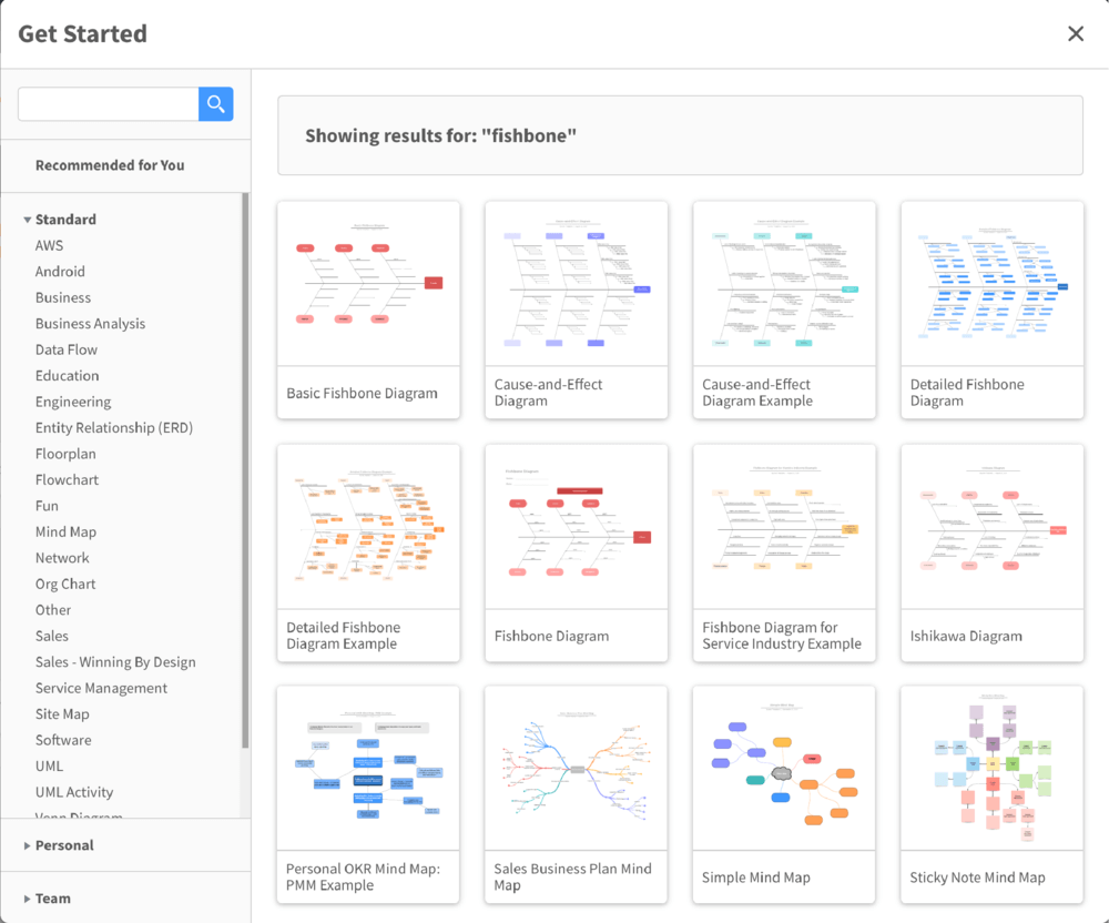- Crea il tuo primo diagramma a spina di pesce da un modello o da un'area di disegno bianca oppure importa un documento.