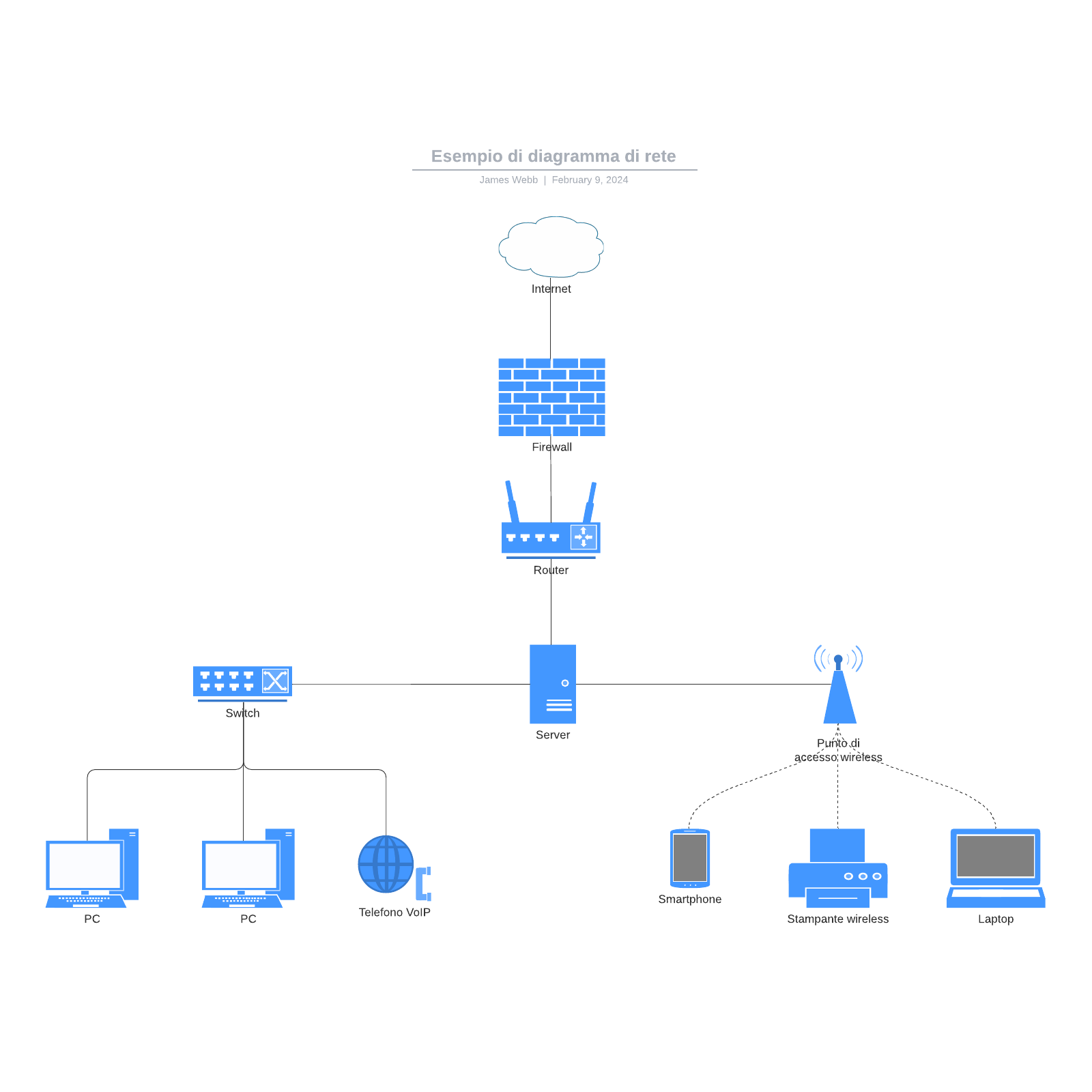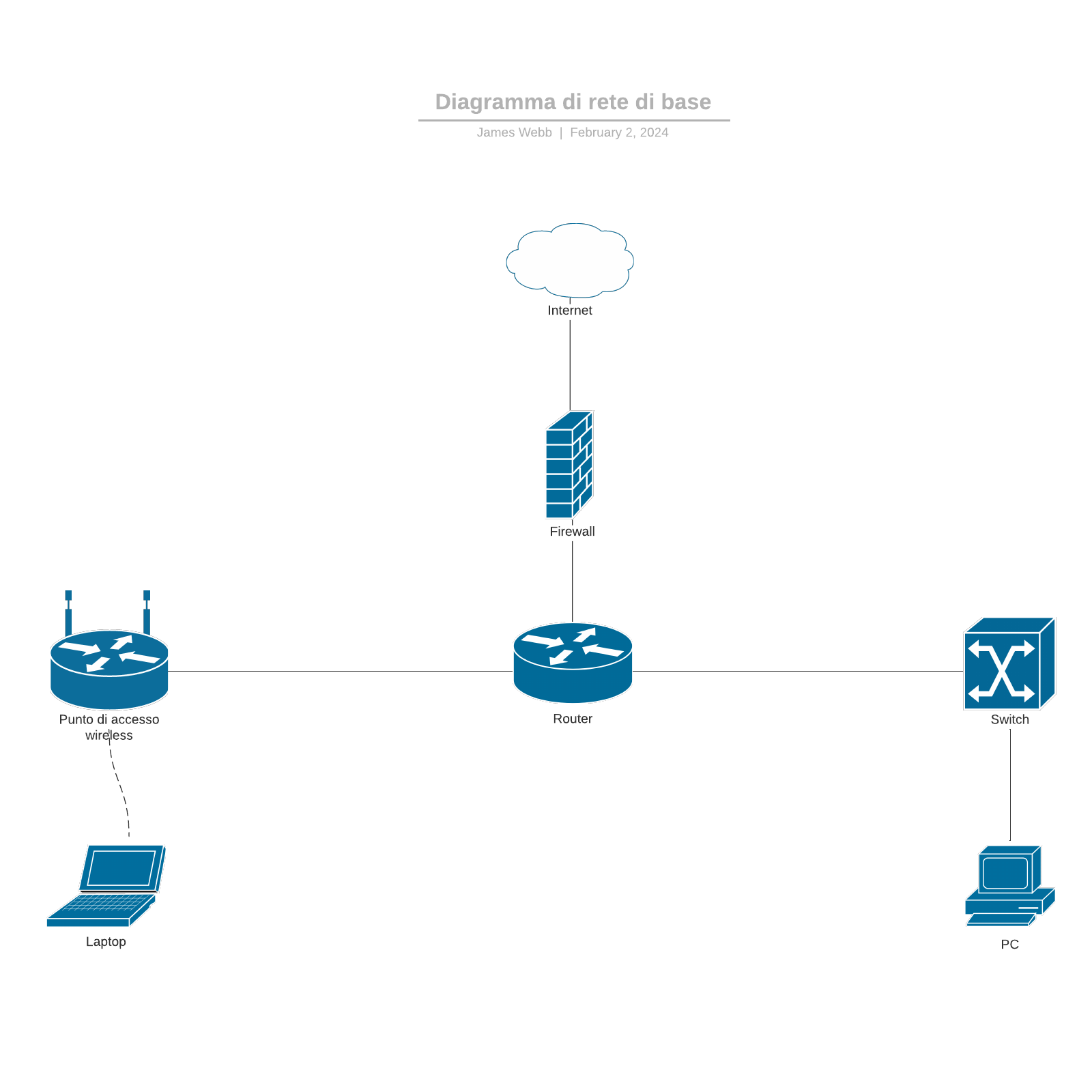 Un diagramma di rete è una rappresentazione visiva di una rete di computer o di telecomunicazioni. Rappresenta i componenti che formano una rete e il modo in cui interagiscono, inclusi router, dispositivi, hub, firewall, ecc. Un diagramma di rete può fungere da panoramica generale o illustrazione dettagliata, a seconda del suo ambito e scopo.