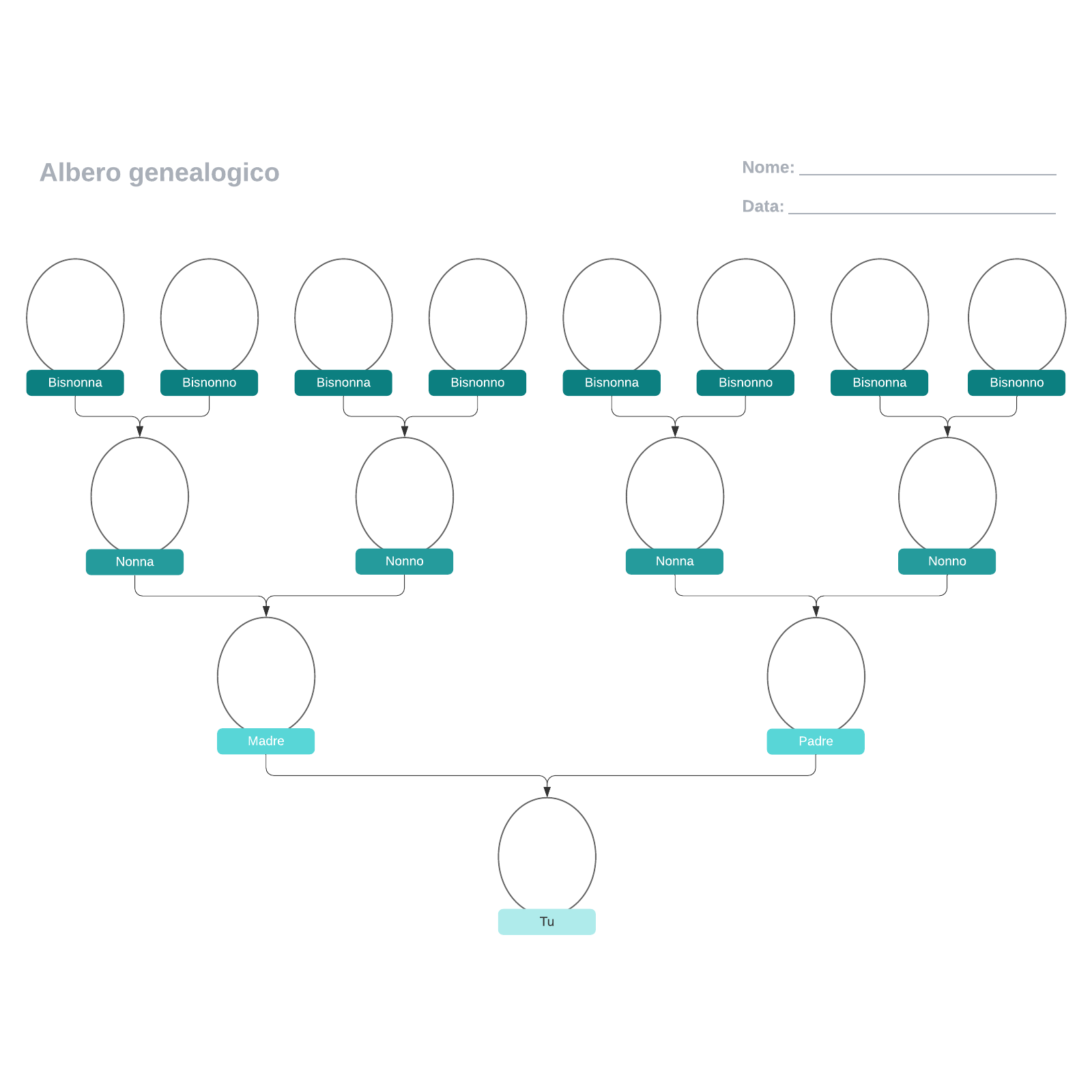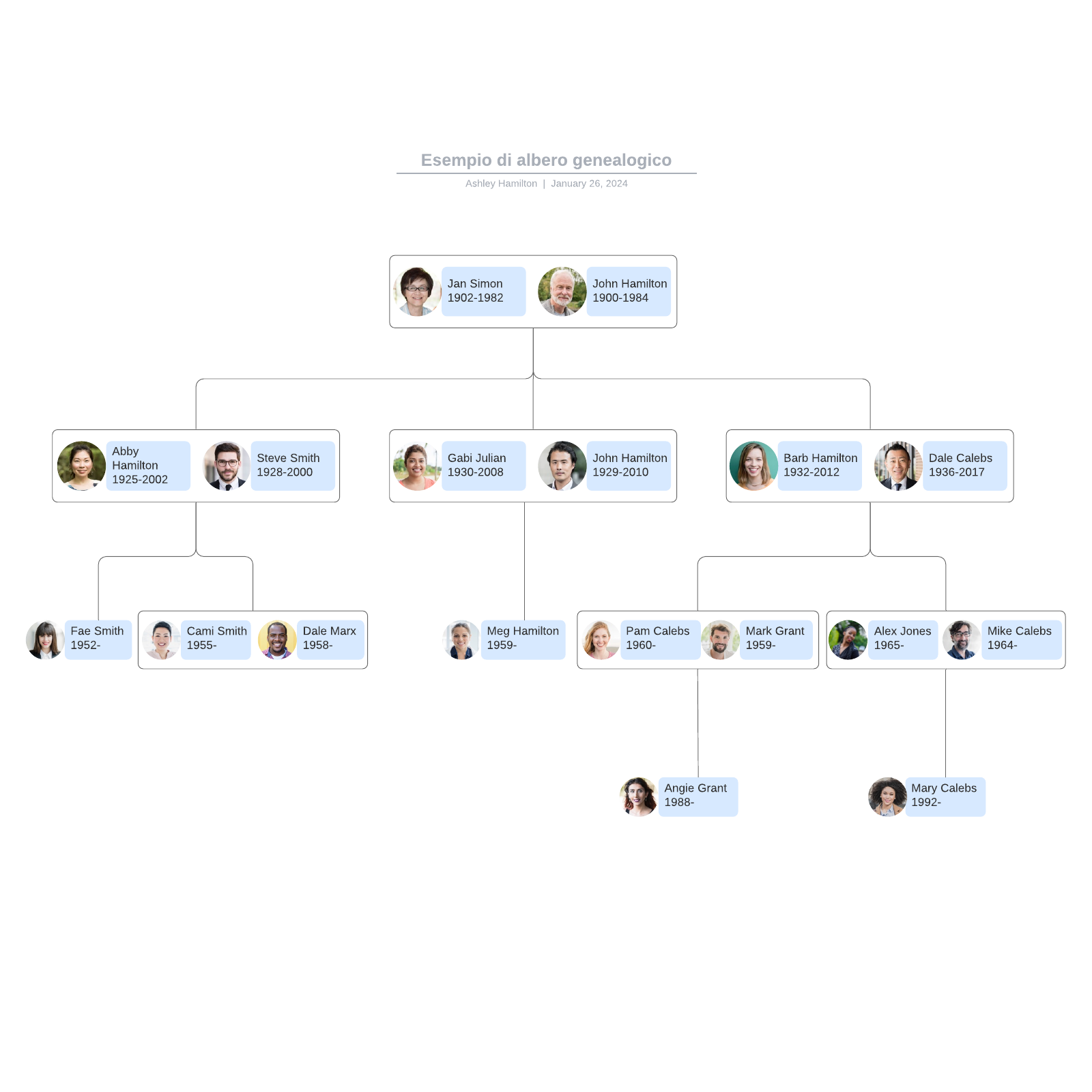 Un albero genealogico è una rappresentazione visiva del lignaggio di una persona, che traccia le relazioni con gli antenati comuni. Graficamente simile a un organigramma, questo diagramma viene solitamente presentato in una struttura ad albero che ha un individuo come radice. Dalla radice, le linee che rappresentano i rami terminano in riquadri che rappresentano le foglie. Ogni foglia rappresenta i singoli membri della famiglia e include informazioni quali data di nascita, del matrimonio e di morte. Utilizzando un diagramma ad albero genealogico, è semplice registrare persone, luoghi ed eventi che compongono la cronologia familiare e condividere queste informazioni con altri.