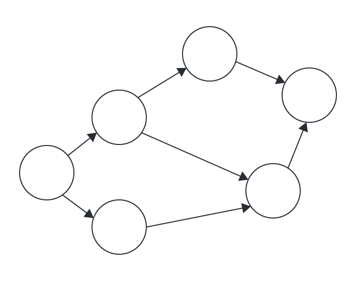 Questo è un altro semplice esempio di grafico PERT con layout verticale. Questo esempio utilizza anche nodi circolari per rappresentare l'ordine di attività, con il percorso critico contrassegnato da un contorno rosso.