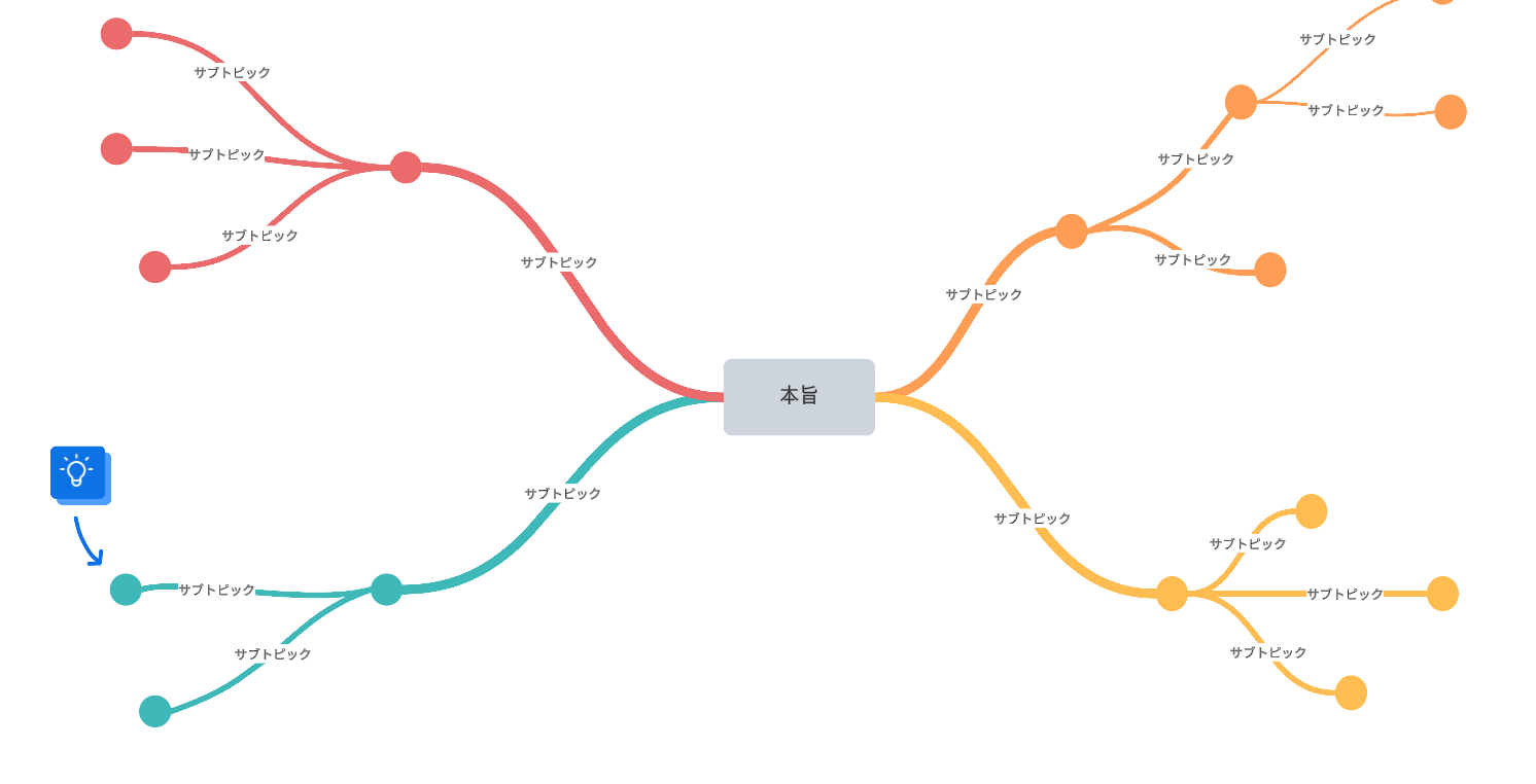 マインドマップは、思考を捉えるための方法です。中心となる概念から始めて、そこから関連する概念へ続くブランチを作成し、自由にアイデアを追加したり、つなげたりすることができます。マインドマップはビジュアルで思考する人に最適で、柔軟な構造のため、ブレインストーミングにすぐに活用できます。