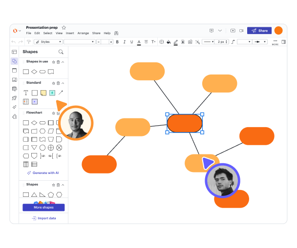 共有可能なURLを作成したり、プレゼンテーションモードを使ってマインドマップを関係者に効果的にプレゼンできます。さらに、LucidchartはGoogle Workspace、Microsoft 365、Slackなどの人気アプリと連携し、共有プロセスを簡素化し、リソースを一元管理することができます。