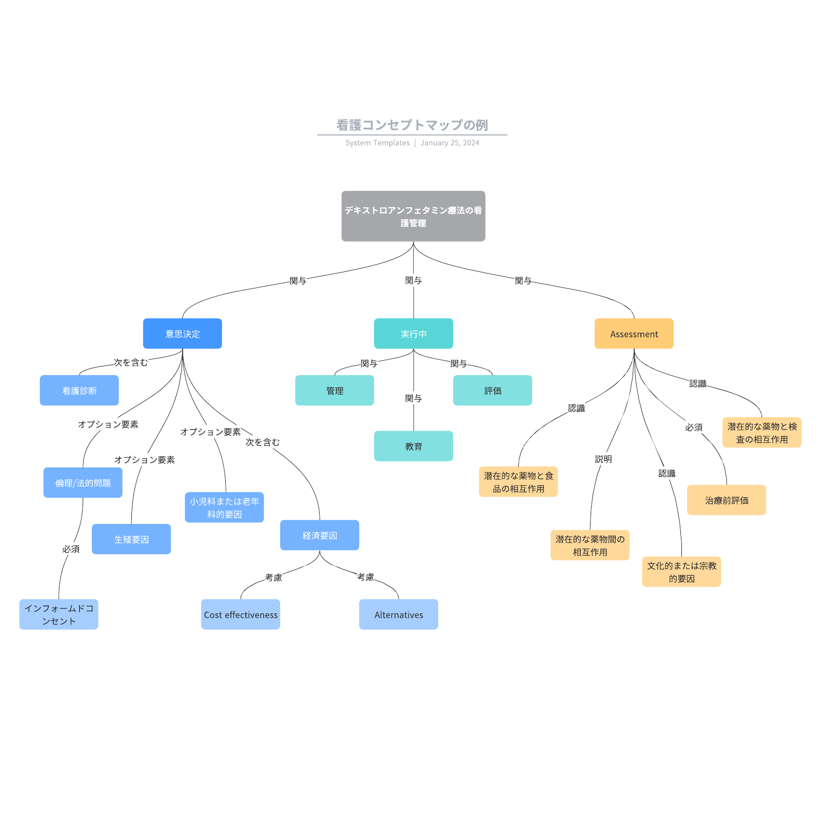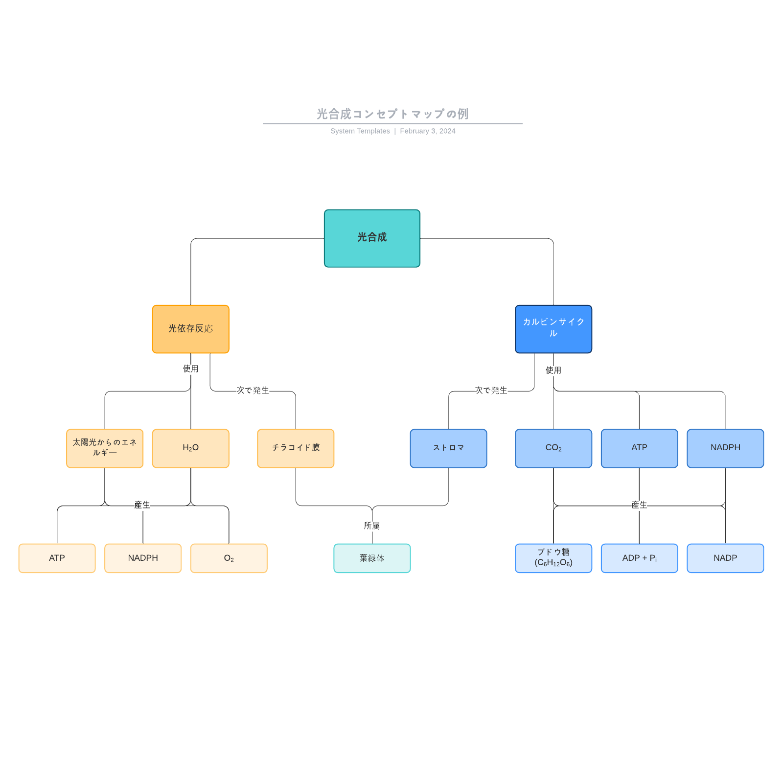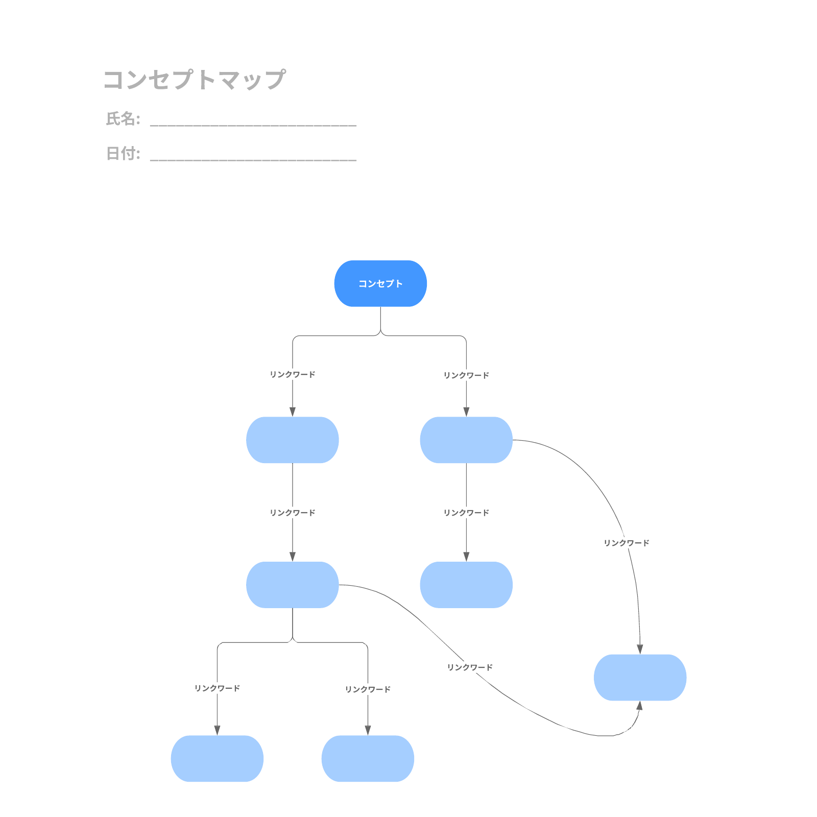 コンセプトマップ (概念図) は、コンセプト、アイデア、イベントやメモの関係を視覚化するのに役立ちます。カリキュラムの計画、学習ガイドの作成やプロジェクトの概要作成に一般的に使用される図です。 コンセプトマップを使用するには、アイデアを円 (別名ノード) に入れます。中央から始まり外側に拡げていくマインドマップとは異なり、コンセプトマップは通常、階層内で上から下に作成していきます。円を線または矢印 (別名アーク) で接続し、線にラベルを付けて、アイデアが互いにどのように関連しているかを示します。
