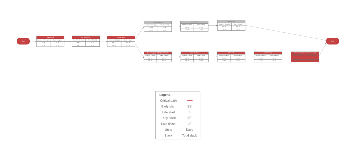 クリティカルパス法とは、プロジェクトの期間と完了の決め手となる重要な一連のタスクとイベントを特定し、スケジュールを設定するために一般に使用される手法です。クリティカルパスを明確に定めることで、プロジェクトマネージャーや関係者は、プロジェクトの開始時点から想定される内容と期限を効果的に管理できるようになります。Lucidchart のクリティカルパスツールを使えば、プロジェクト全体の概要をイメージするのも簡単です。所要時間を計算して個別のタスクの重要度を決定し、プロジェクト完了に至るまで、予定に照らして合わせて実際の進捗状況を確認できます。