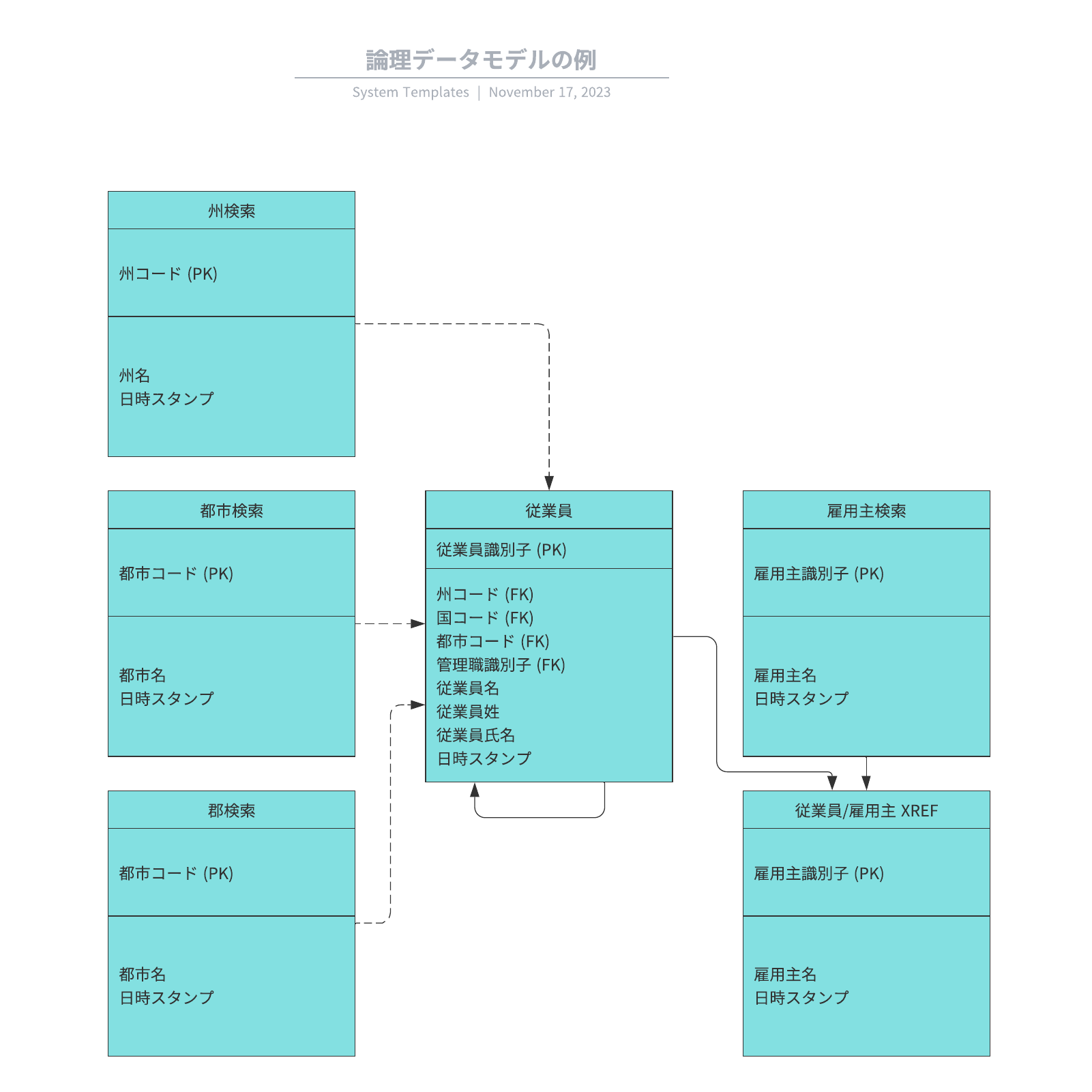 データベース図は、データの格納やアクセス方法を決定する関係や制約を含めたデータベースの論理構造を示します。設計者が採用する、より上位のデータモデルのルールや概念に基づき、個々のデータベースモデルが設計されます。データモデルの大半は、付属するデータベース図により表現することができます。