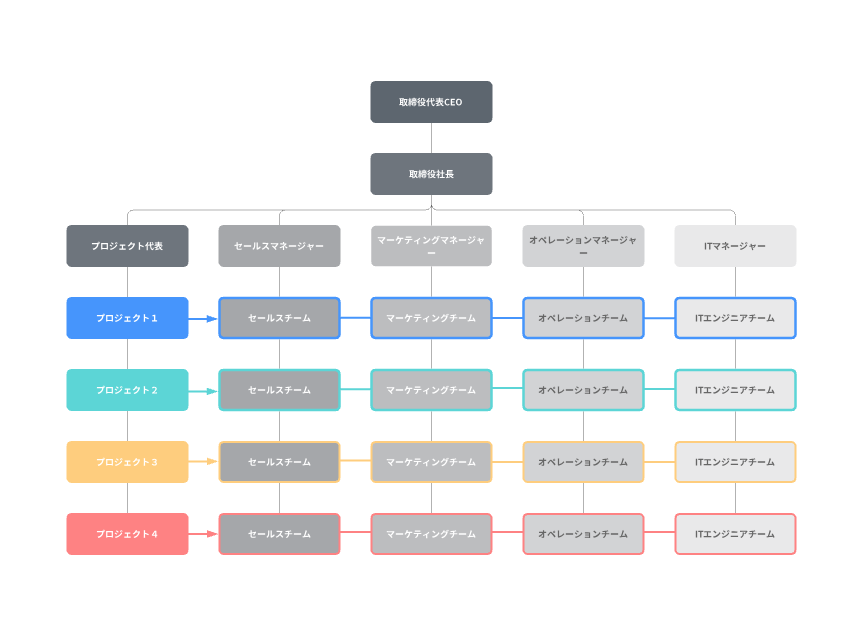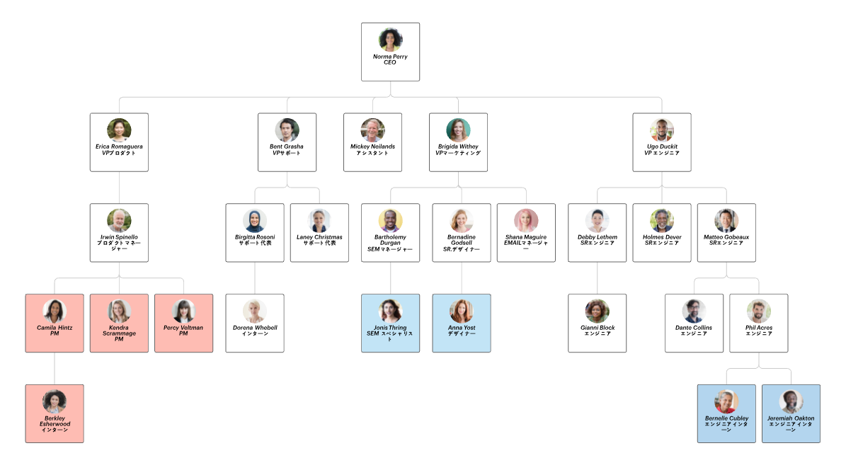 Lucidchart の人事管理ソフトウェアのグループビューを使えば、従業員グループの確認や、拠点、プロジェクトチーム、役職ロールなどの基準に基づいて従業員を グループ化し、階層以外の関係を組織図で確認するのことも簡単です。さまざまな用途で柔軟に使えるLucidchartで、組織内で重要性の高い関係を視覚化していきましょう。