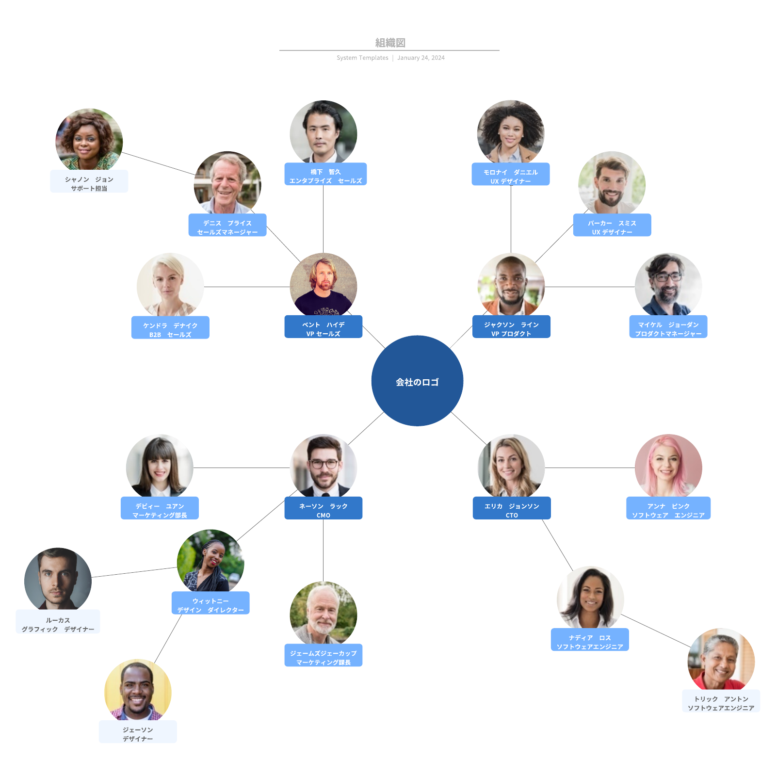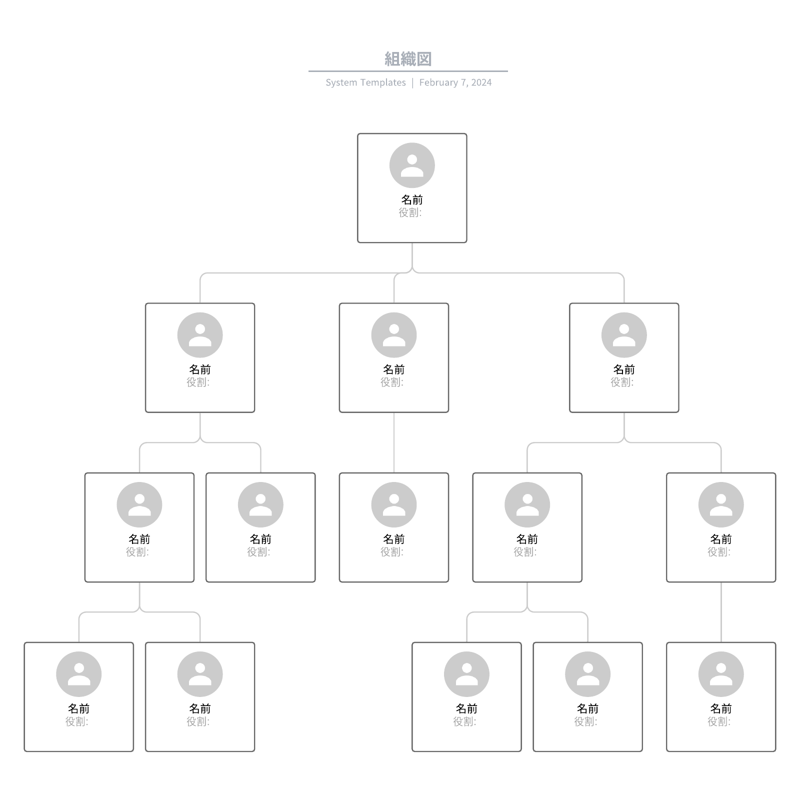 組織図とは、組織の構造をマッピングした図です。各人をボックスで表し、ボックス同士を線でつないでいます。一般的に、縦線は上の人が下の人を管理していることを示し、横線はメンバーが仲間であることを示します。組織図を見れば、誰が誰の部下か、その人の役職、所属するチームや部署がすぐにわかります。特定の問題について誰に相談すべきかを検討する場合や、非効率性を減らすためにチームを再編成する場合に役立つ図です。