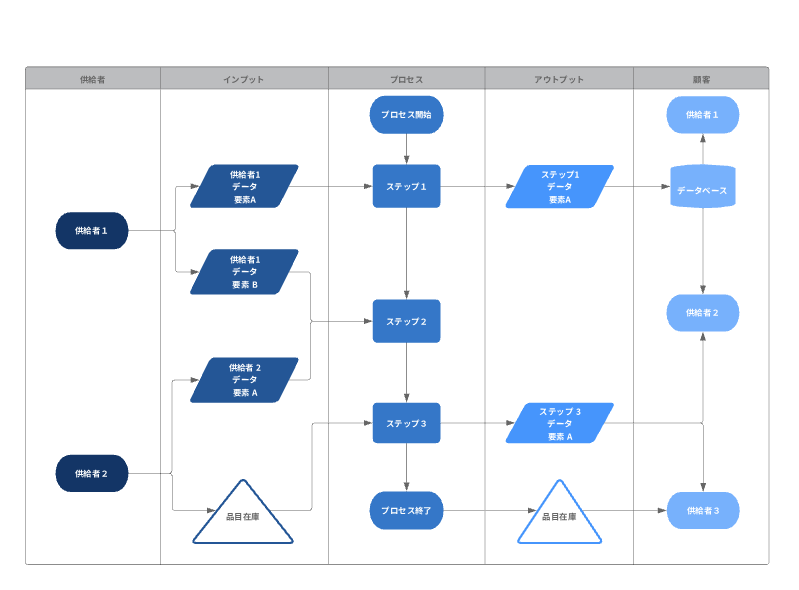 各ステップを実行するチームやロール、他部門に及ぼす影響などを含め、プロセスワークフローをステップ別に分けます。この情報を利用してスイムレーンを特定していきます。