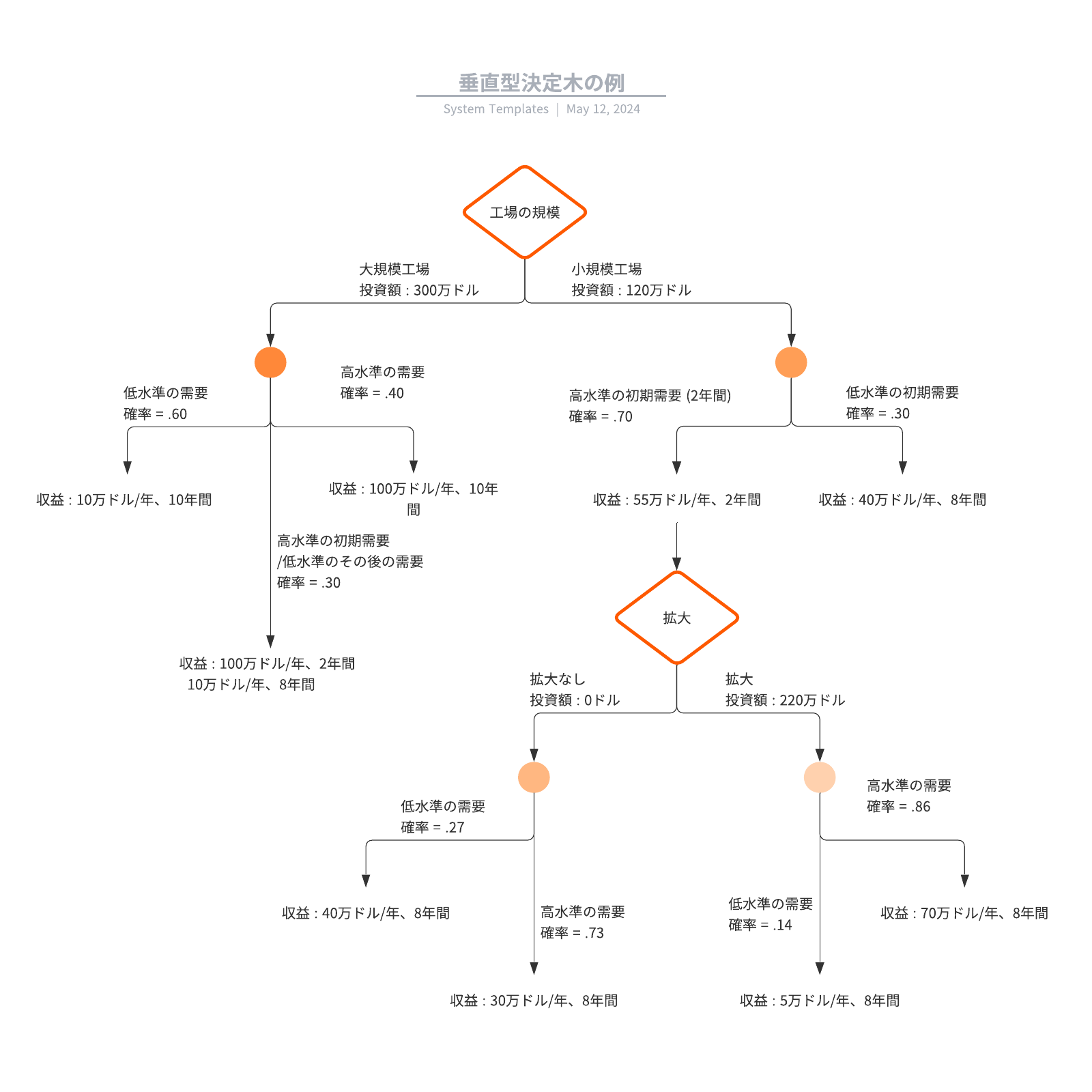 各決定ノードから想定しうる解決策を描き、各確率ノードからは想定しうる結果を示す線を描きます。選択肢を数値的に分析する場合には、各結果の確率と各アクションの費用も含めます。