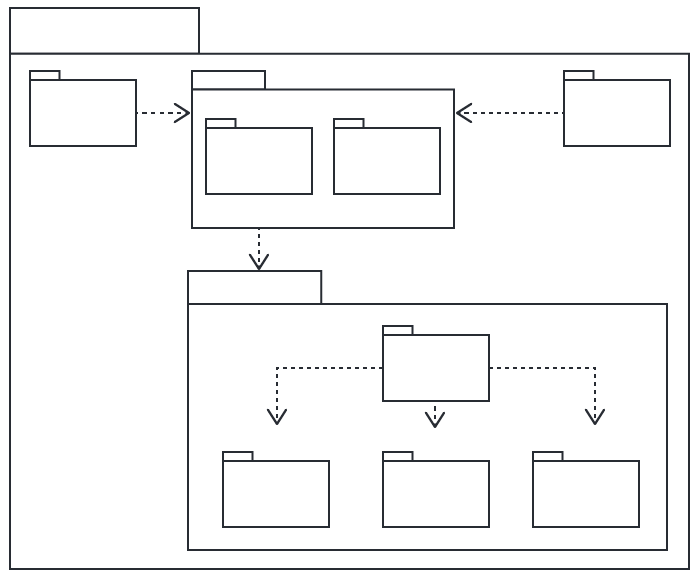パッケージ図とは、パッケージの形でさまざまなモデル要素の構成と配置を示すために使われる構造図です。パッケージとは、図、文書、クラスやその他のパッケージなどの関連する UML 要素のグループを指し、図内ではファイルフォルダーとして表されます。各要素がこのパッケージの中にネストされ、図内で階層を構成します。パッケージ図は一般に、ソフトウェアシステムなどの UML 分類子内の階層型アーキテクチャ編成を視覚的に表すために使用されます。