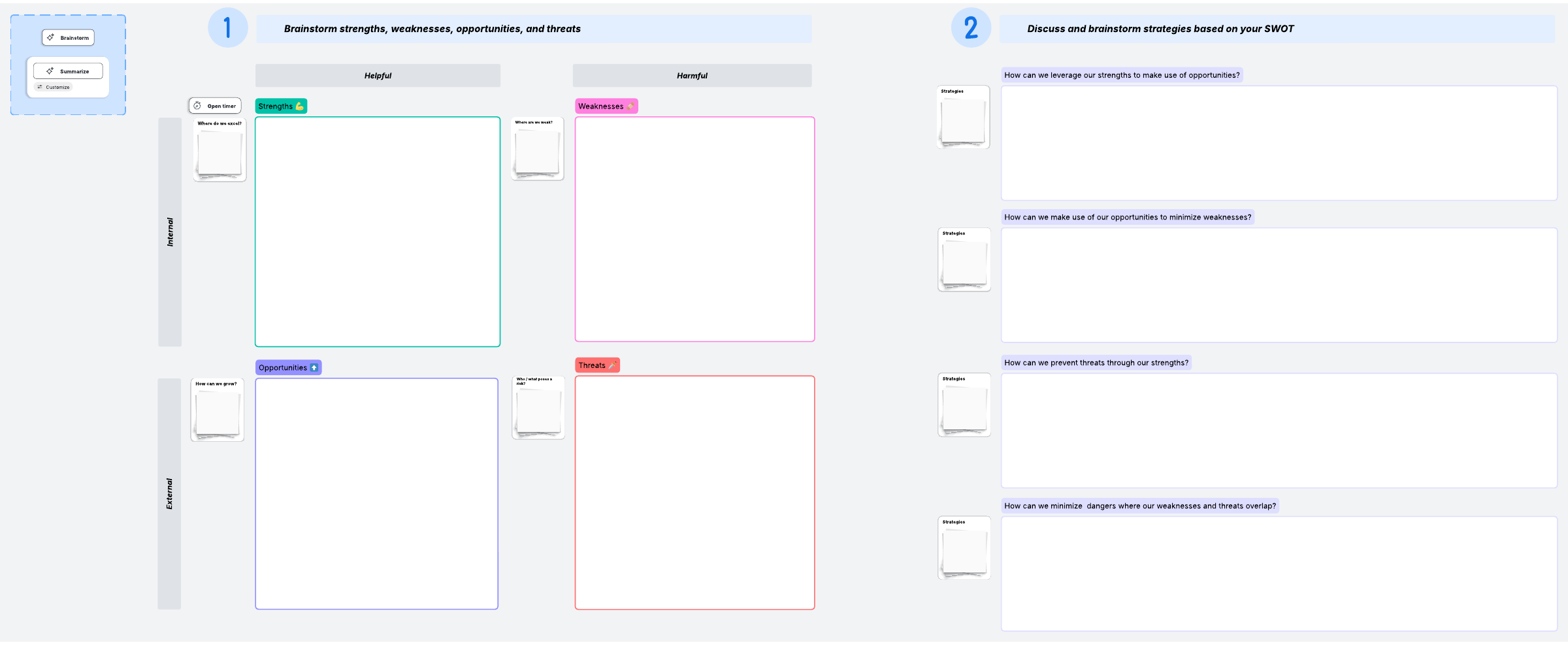 SWOT 분석은 조직이 잠재력을 최대한 활용하고 발생할 수 있는 문제를 해결하는 데 도움이 되는 간단하면서도 효과적인 도구입니다. 강점과 기회를 시각화하고, 우선순위를 정하고, 잠재적인 내부 및 외부 위협에 대비한 안전 장치를 구현하세요.