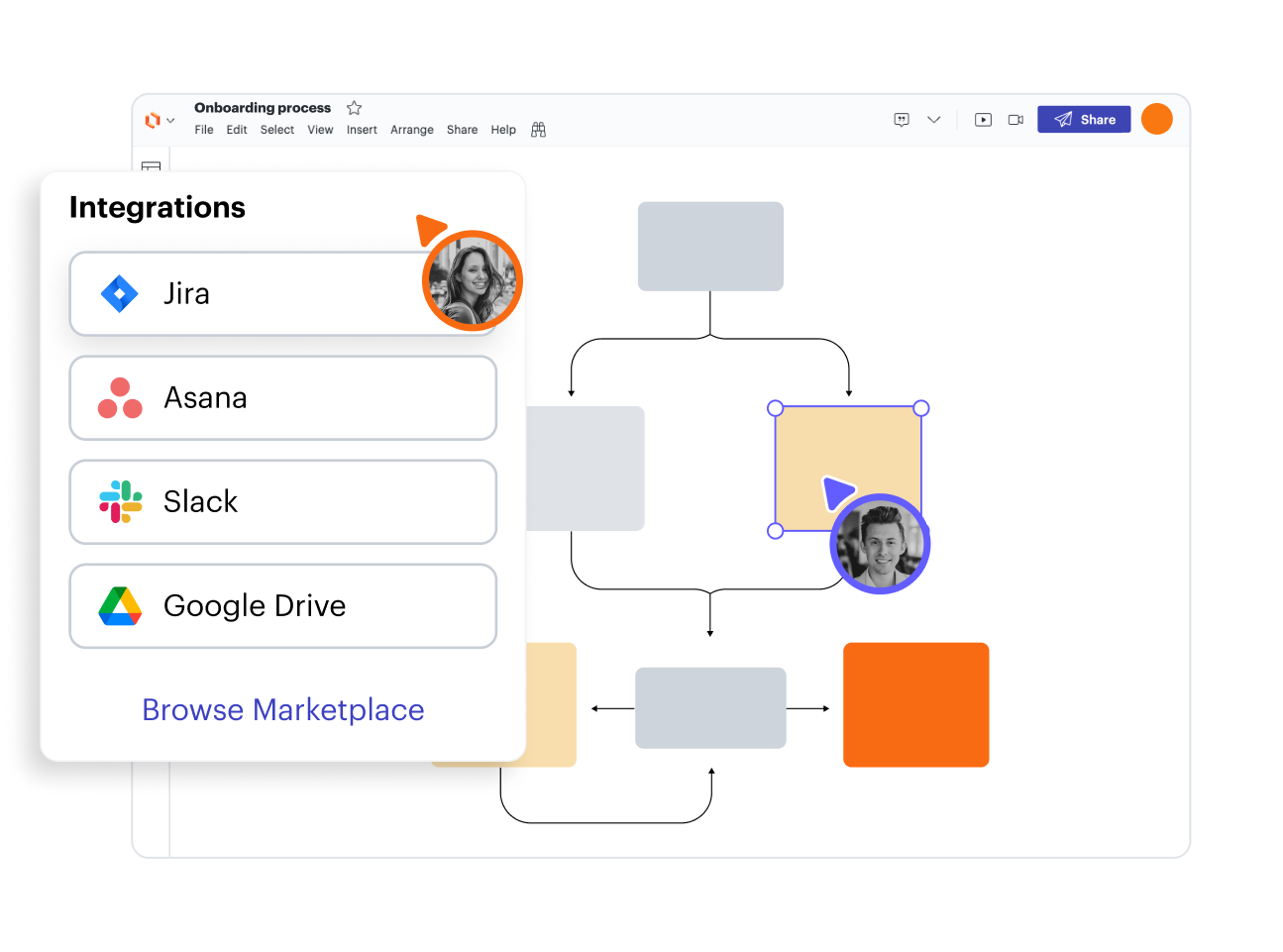 Connect Lucidchart with apps from top providers such as Atlassian, Google, Microsoft, Slack, and more.