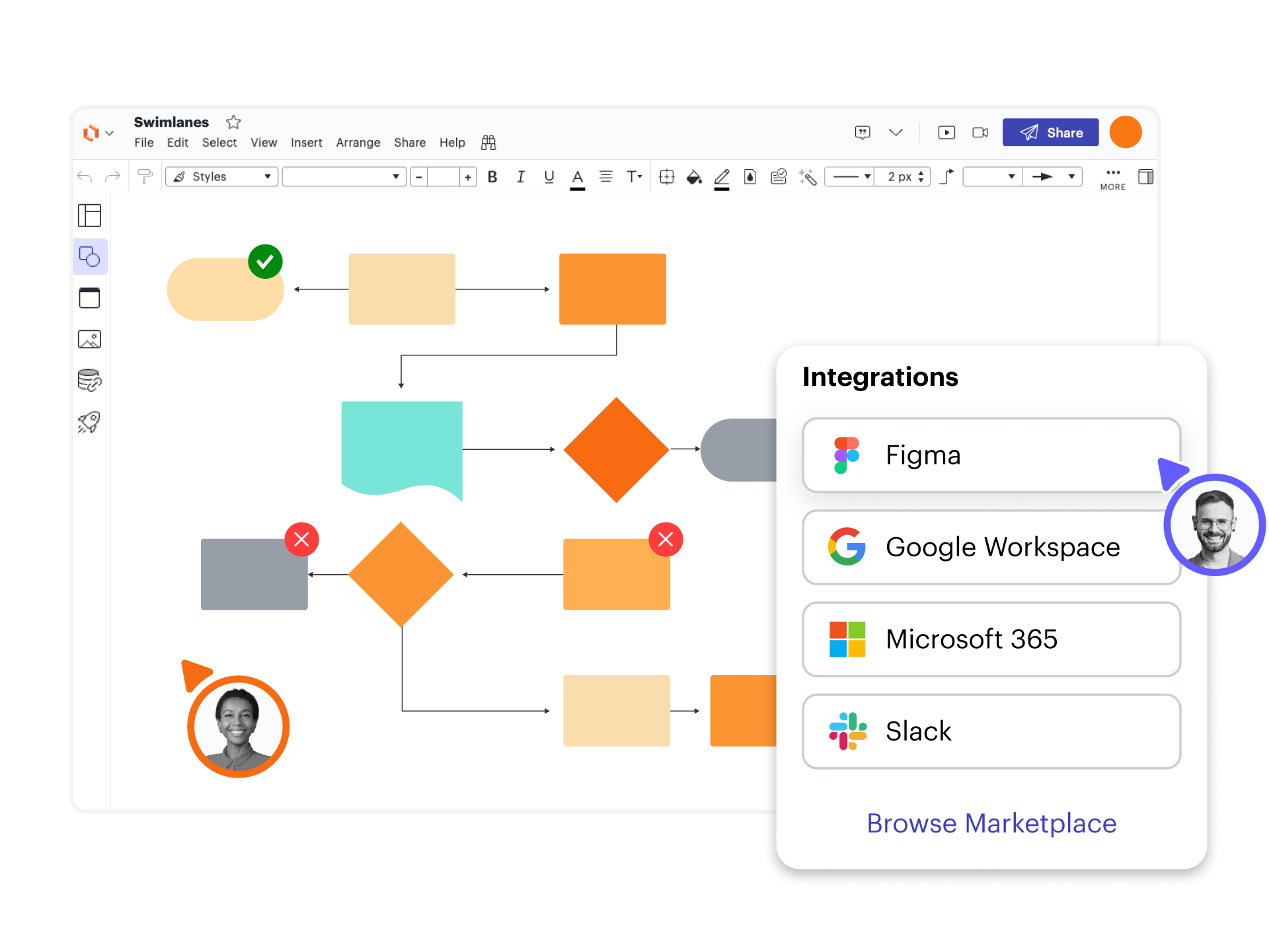 Connect Lucidchart with the apps your team uses most, such as Google Workspace, Microsoft 365, Slack, and more.