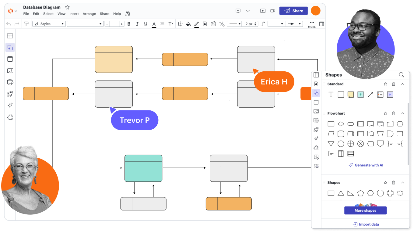 Create database diagrams with customized text, styling, and relationships between fields. Automatically generate database tables and schemas using our SQL import feature.