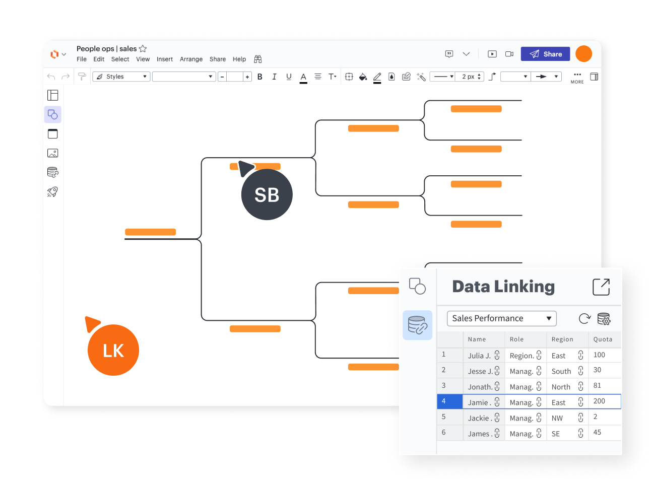 Lucidchart’s data linking capabilities give you the power to sync genogram data to spreadsheets, so your charts automatically stay up to date.