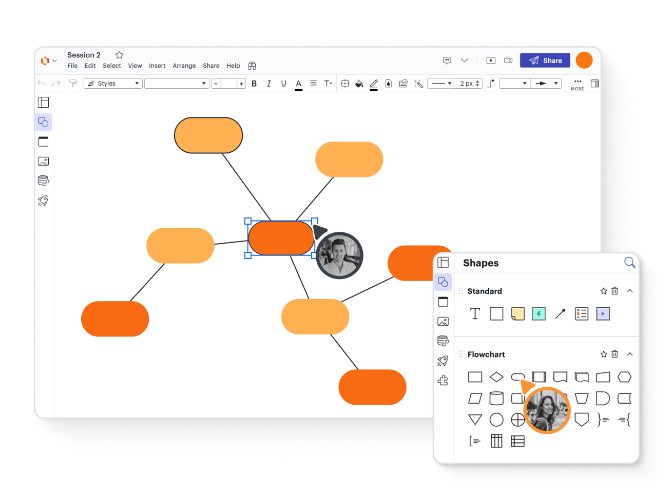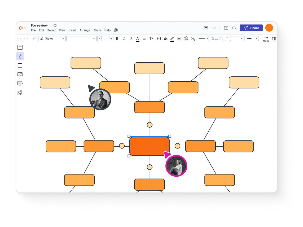 Easily capture and organize your thoughts with drag-and-drop shapes and lines. Use AI to generate or expand on ideas, and collapse or expand branches for a clean design.