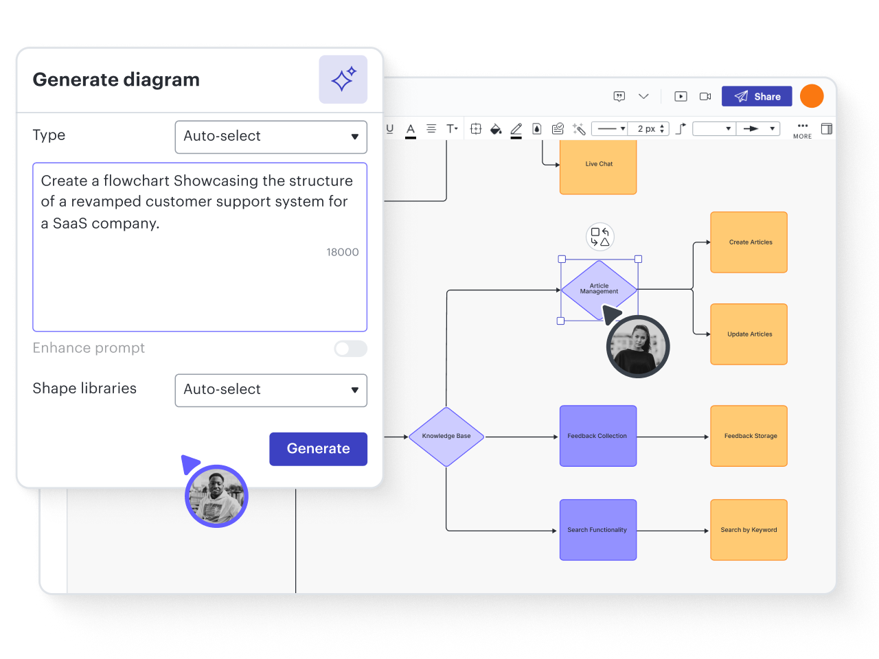 Use AI in Lucidchart to effortlessly transform text prompts into polished flowcharts and diagrams that you can iterate on.