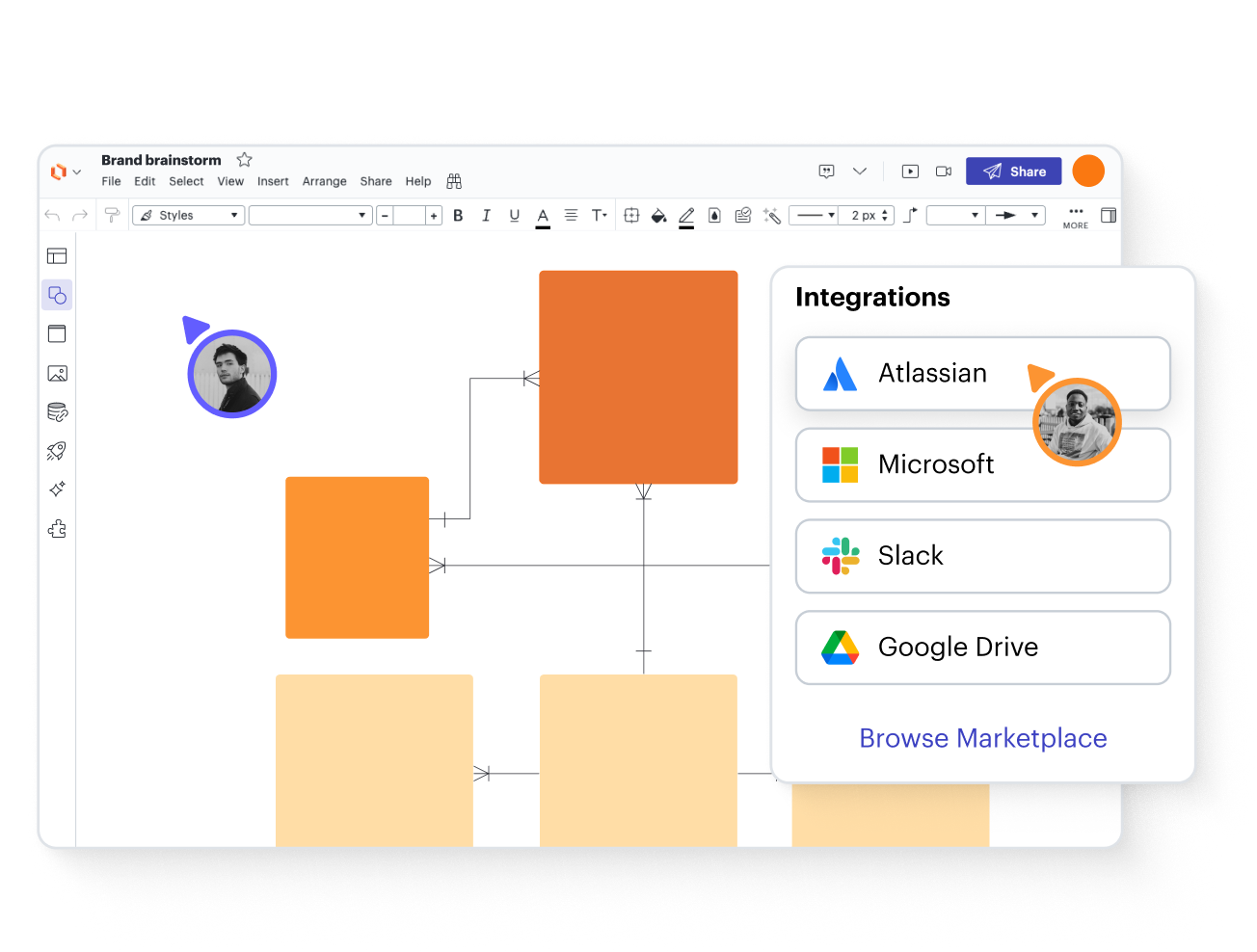 Connect Lucidchart with apps from top providers such as Atlassian, Google, Microsoft, Slack, and more.
